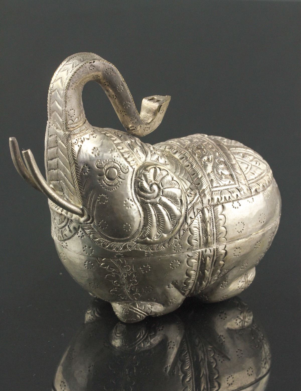Thai silver jewellery box with jewellery set; the box of elephant shape; jewellery set comprised of blue gem hair pin, two pairs of silver earrings, filigree bracelet and necklace; H: 11.5 cm, L: 15 cm, 220 grams total