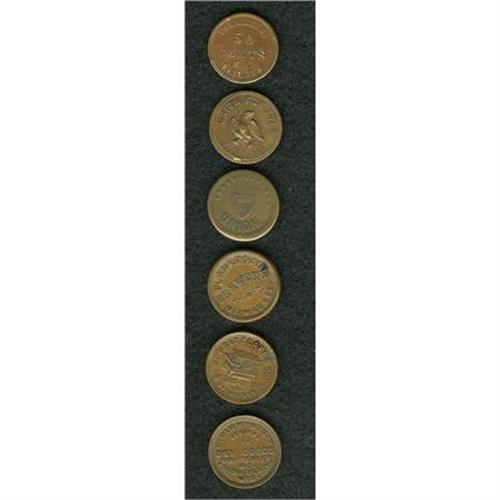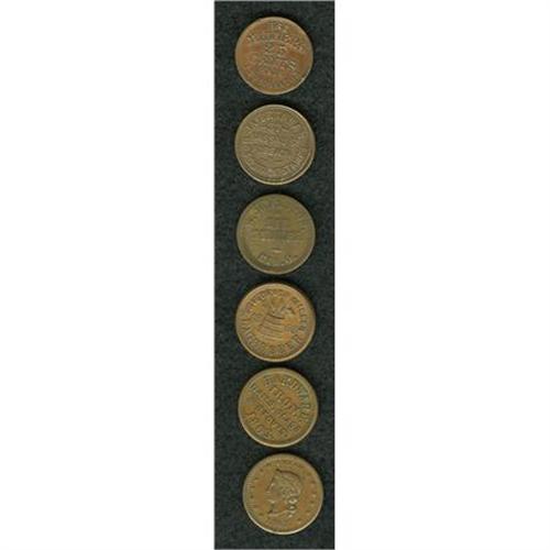 <B>6-Piece Civil War Merchant Token Group.</B></I> Issued by various merchants from New York, Ohio, and Wisconsin. <B>Fuld-NY630AY-1a, NY630I-2a, OH165CF-3a, WI140A-2a, WI510AB-1a,</B></I> and <B>WI510AG-1a.</B></I><BR><BR><b>Shipping:</b> Coins & Currency (<a target="_blank" href="http://www.heritageauctions.com/common/shipping.php">view shipping information</a>)