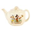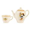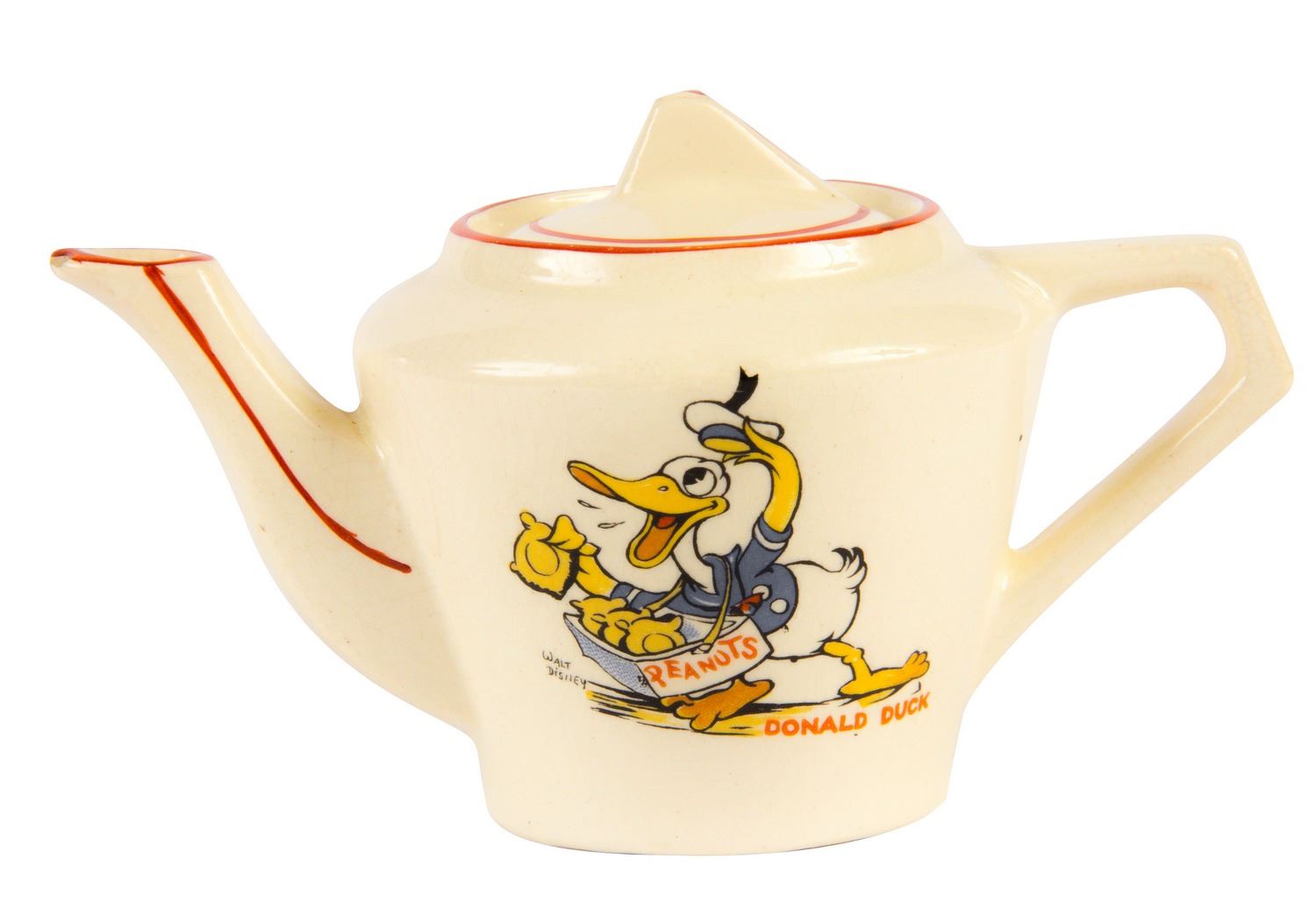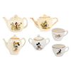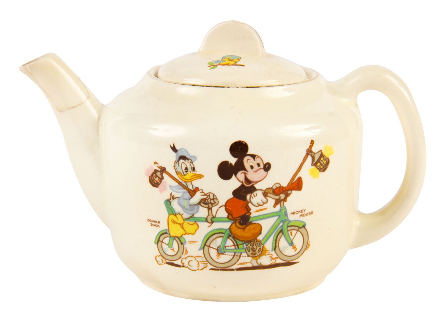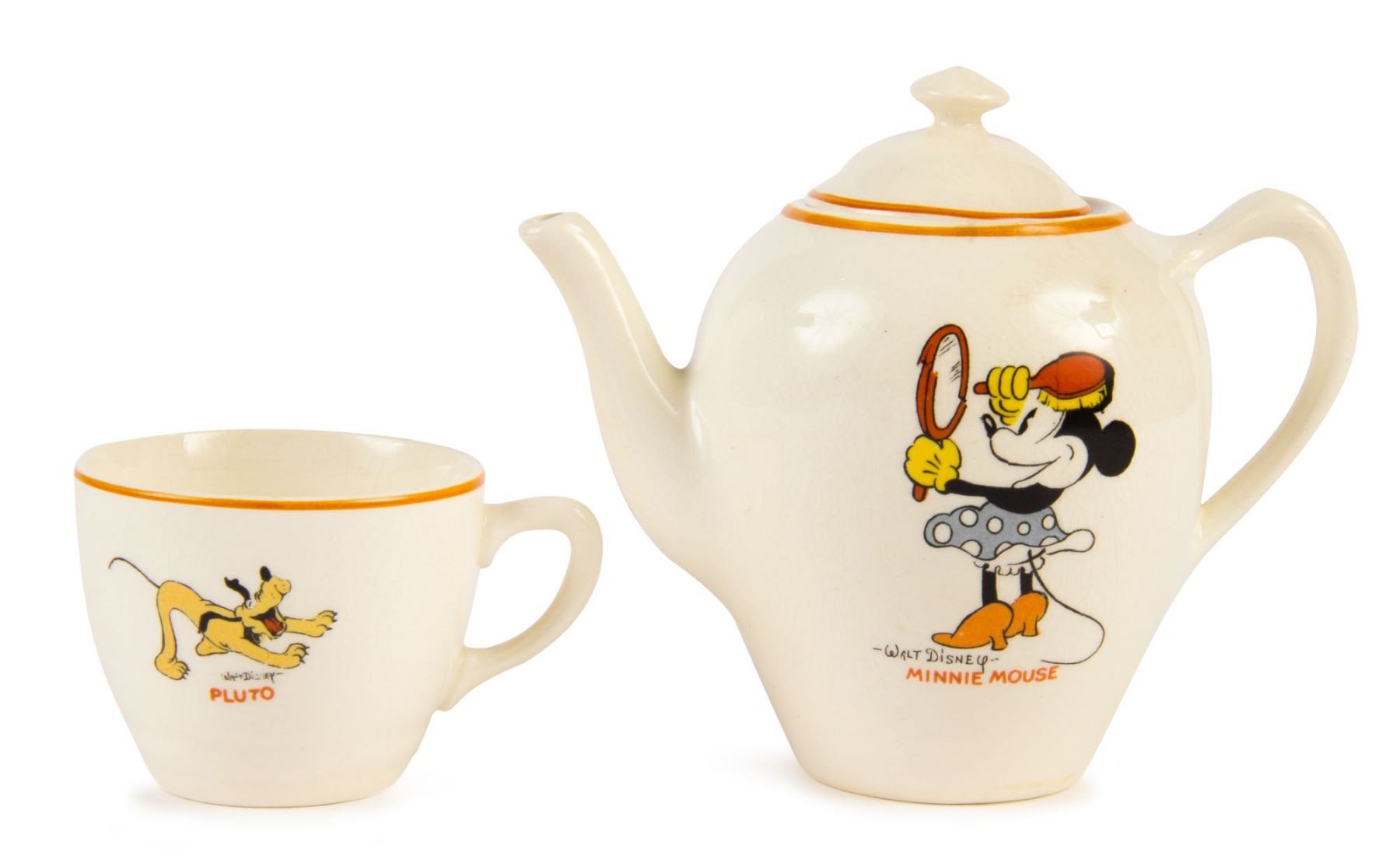 (Wade Heath/Beswick/S.C. Co., c.1930s) A collection of (6) ceramic tea set items featuring Disney characters such as Mickey, Donald, Minnie, and Pluto. These items include three tea pots, two cups, and a sugar bowl. While similar in shape, color, and style, the items are from three different manufacturers, showing how licenses for merchandise can change over the years among companies competing to use Disney's popular characters. The set ranges in size from the 2" tall cups to the 4" tall largest tea pot, and is in very good condition overall with minor wear from use and a repaired neck to the largest tea pot.