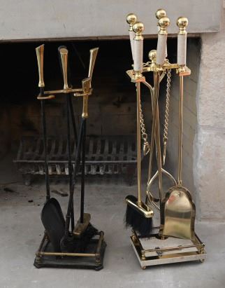 Fireplace pokers, (2) Decorative Pots. Round table with (4) rolling chairs and wood piano bench