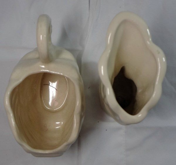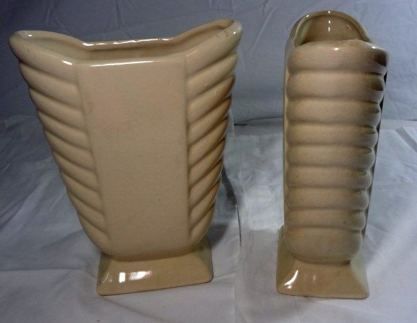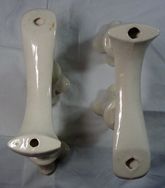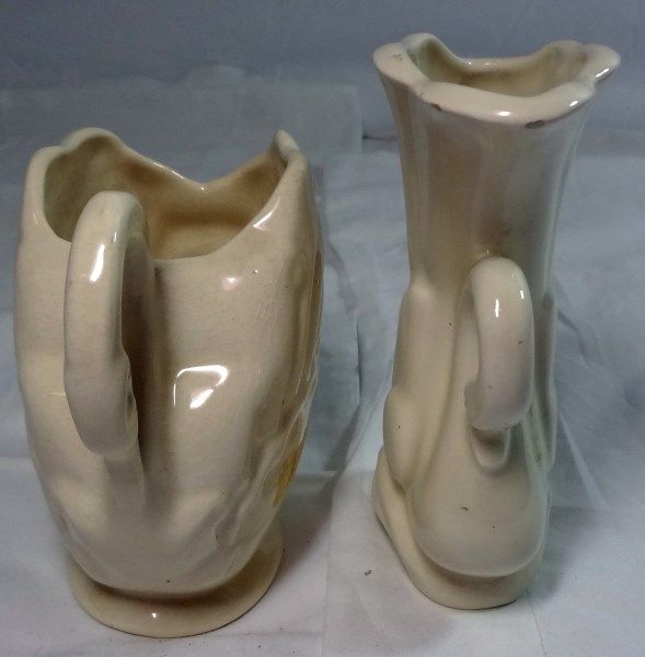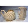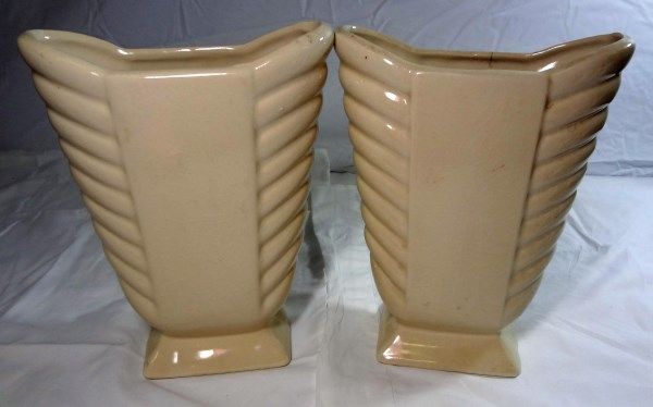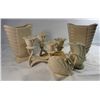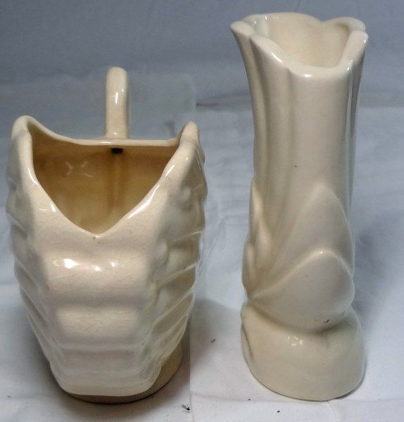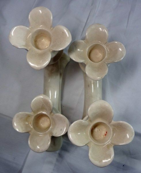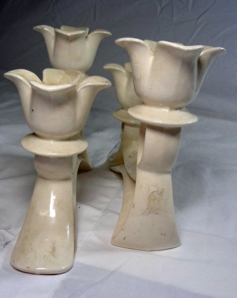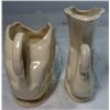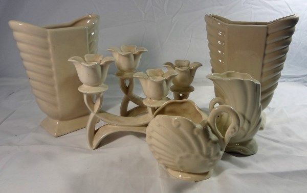 Includes 2 6"x3"x8"tall, Scalloped Vases. Two 7"x6"x2" Candlestick Holders and 2 Small Ivory Swan Vases. Nice Condition. Only one small chip on candlestick.