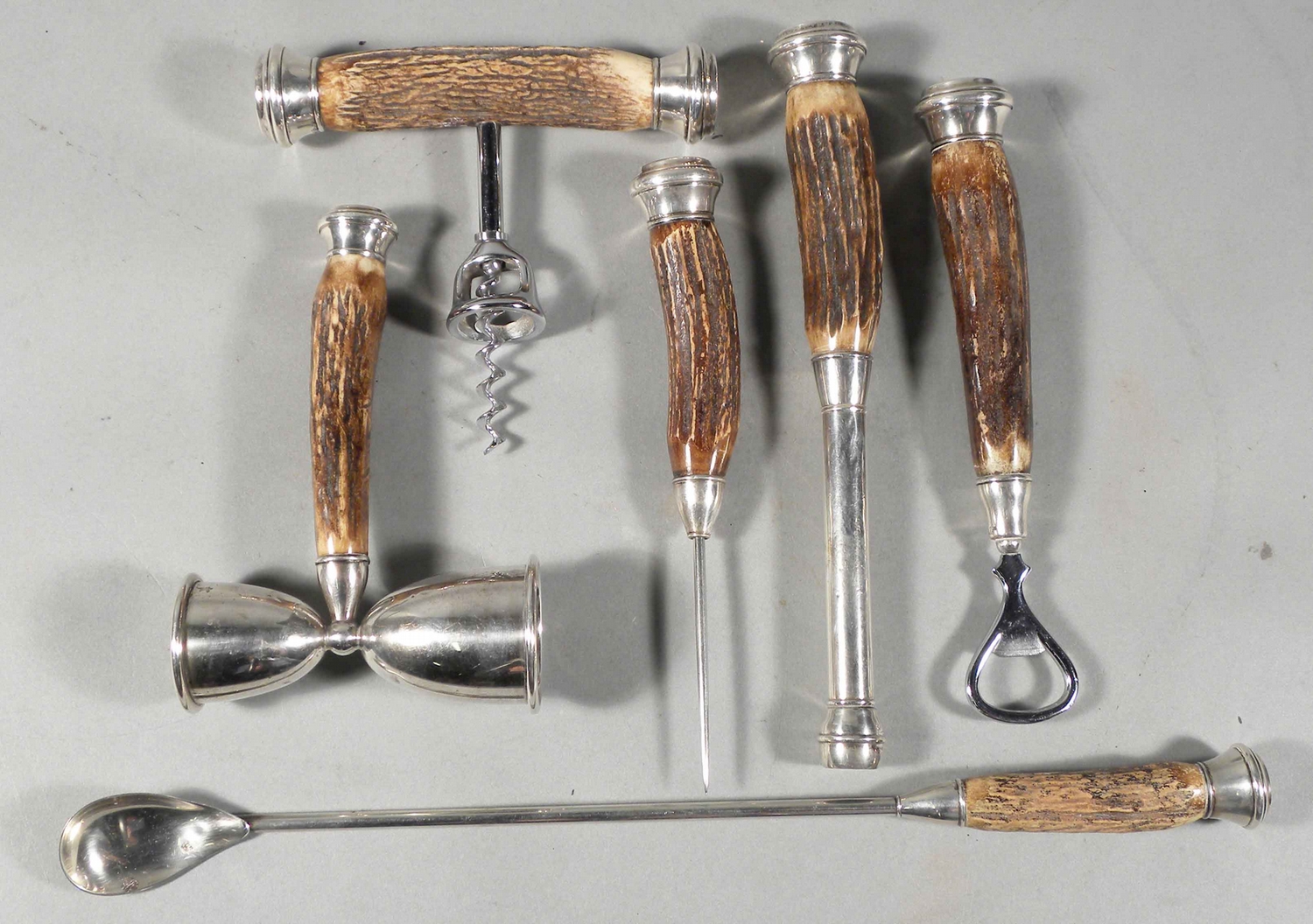 6 Piece Stag Handled & Sterling Bar Accessory Set. Monogram "CLC" on ends. Set included shot measure, ice pick, muddler, cork screw, bottle opener and stir spoon. All in excellent condition.