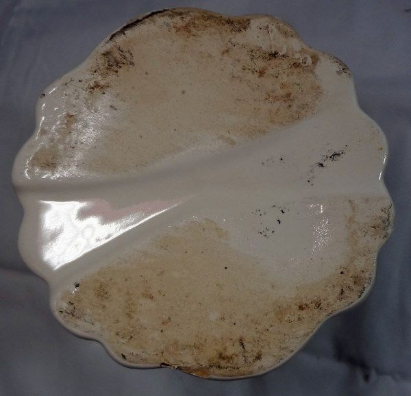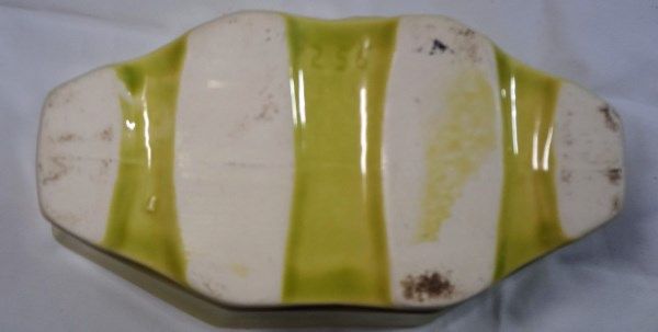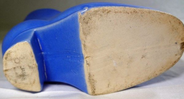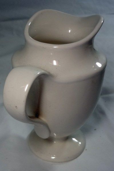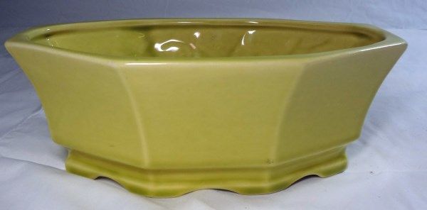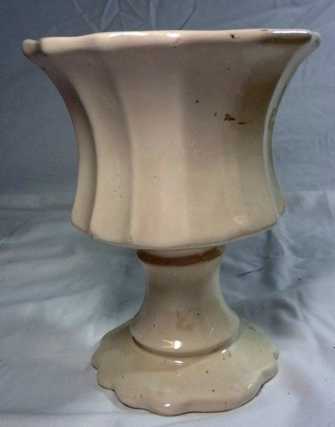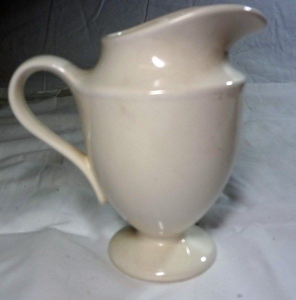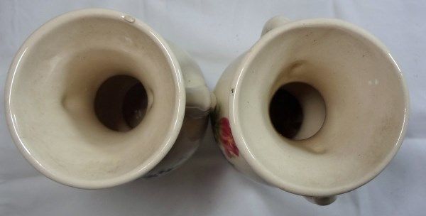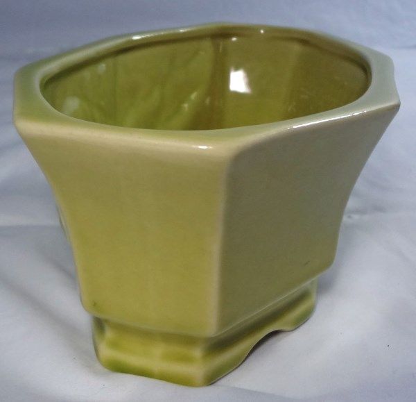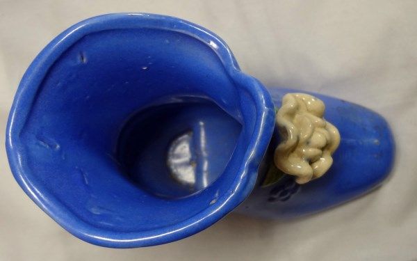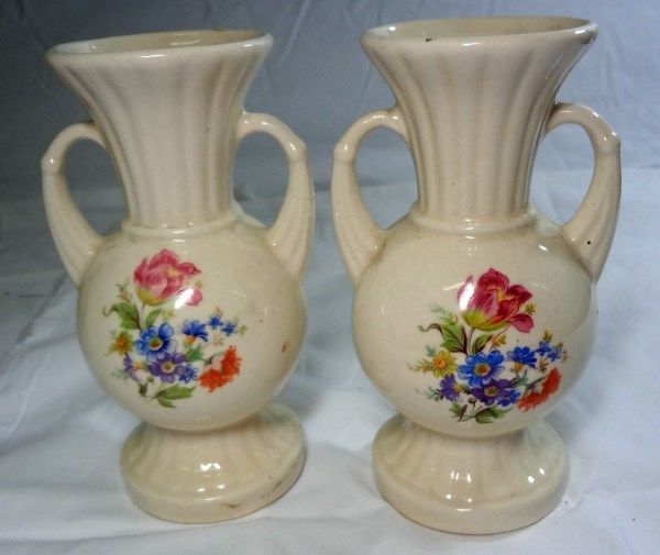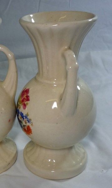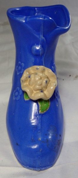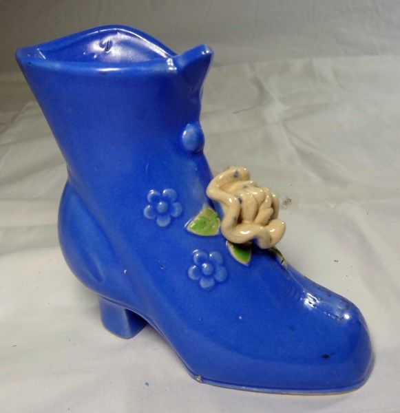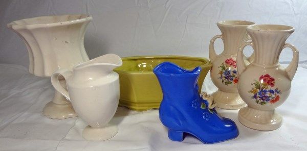 1 Off-white footed planter, 1 small pitcher, 2 small crackle glazed vases with flowers, 1 light green planter with leaves, and 1 small blue shoe planter.