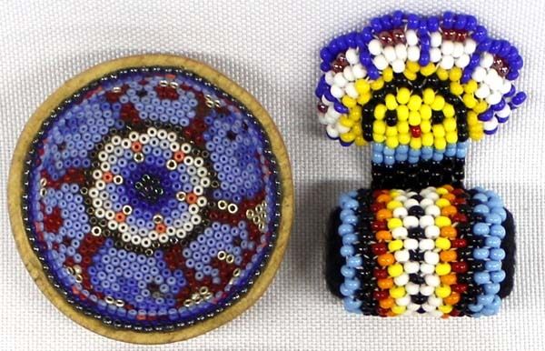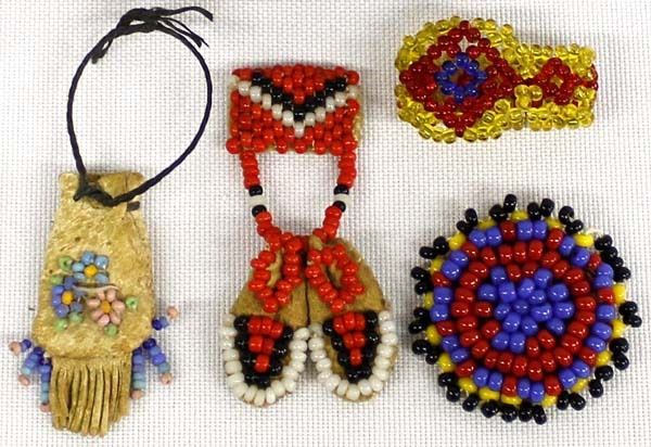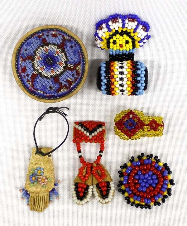 6 Pieces of Native American & Mexican Beaded Miniatures, largest measures 2'' x 1.25'' x .5'', includes 2 pins, ring, moccasins, bag, and a Mexican Huichol Beaded Gourd Bowl