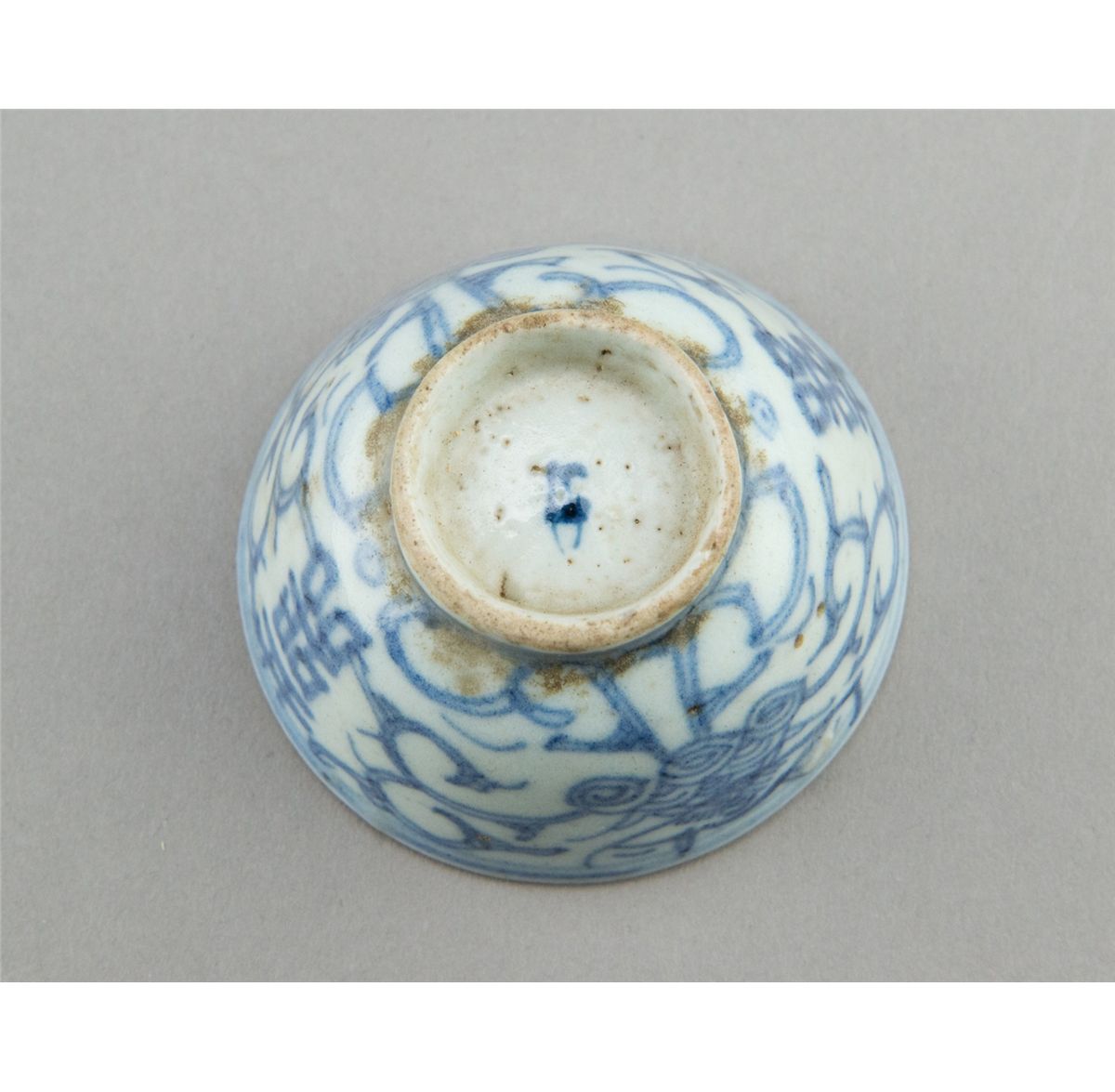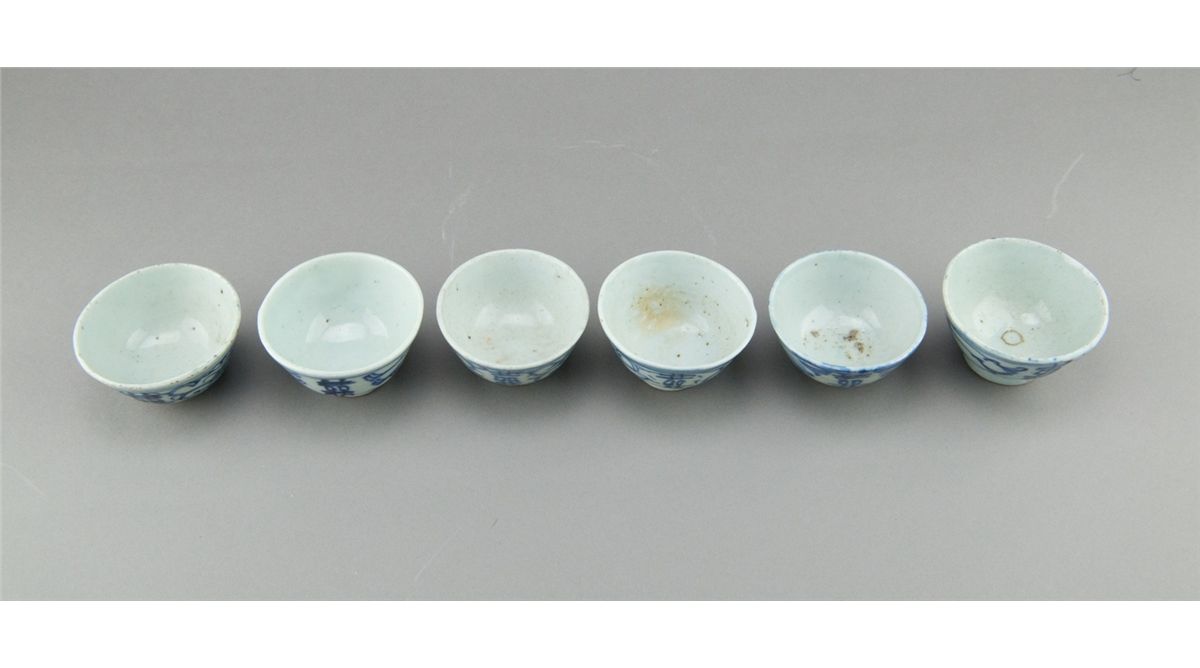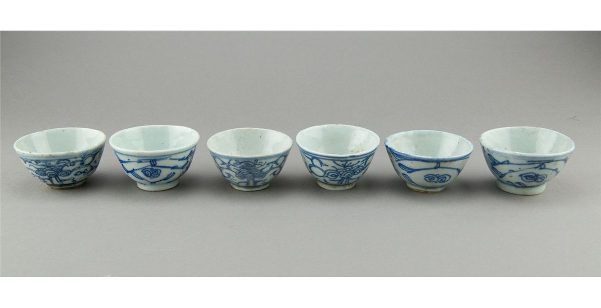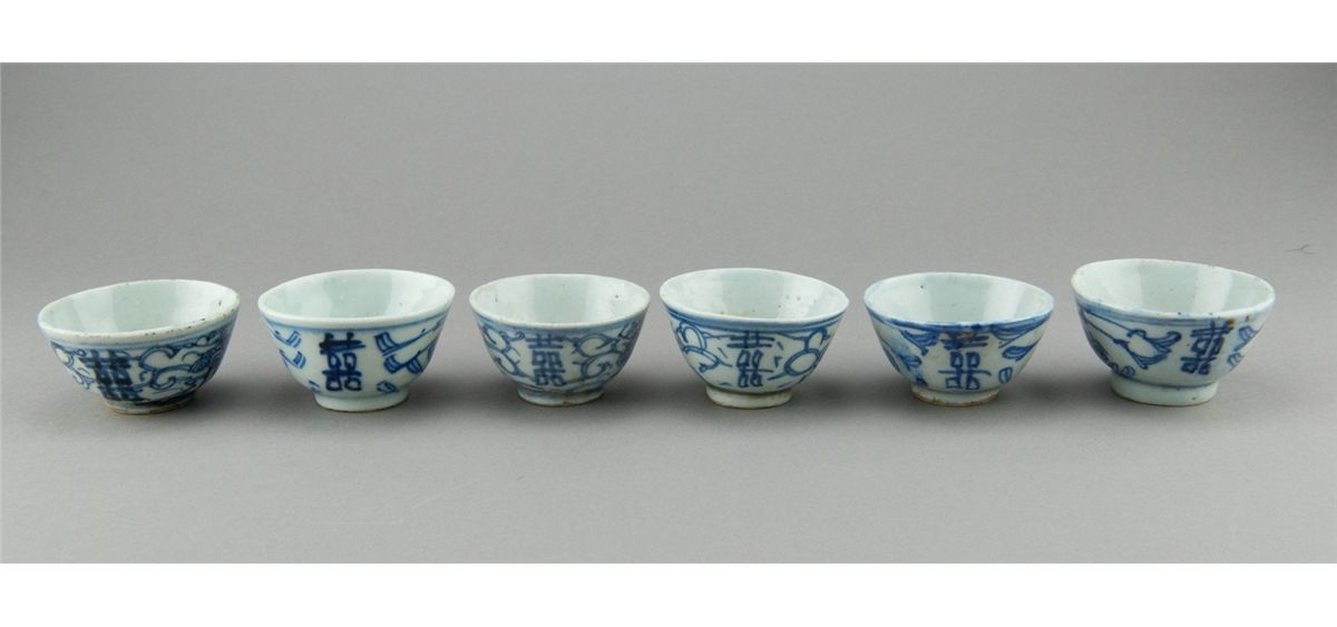 Set of six Chinese Ming style blue and white porcelain cups, decorated with Chinese characters `He` meaning happiness, base with mark. H: 4 cm, D: 6 cm, 48 grams.