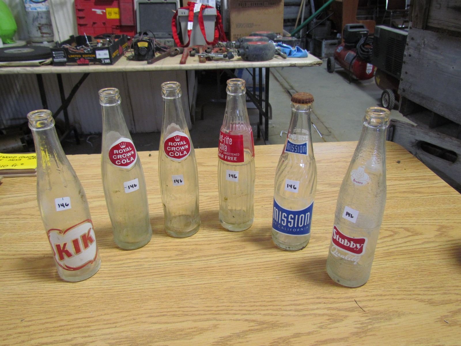 6 Pop bottles, Kik, 2 Royal Crown, diet rite Cola, Mission, Stubby