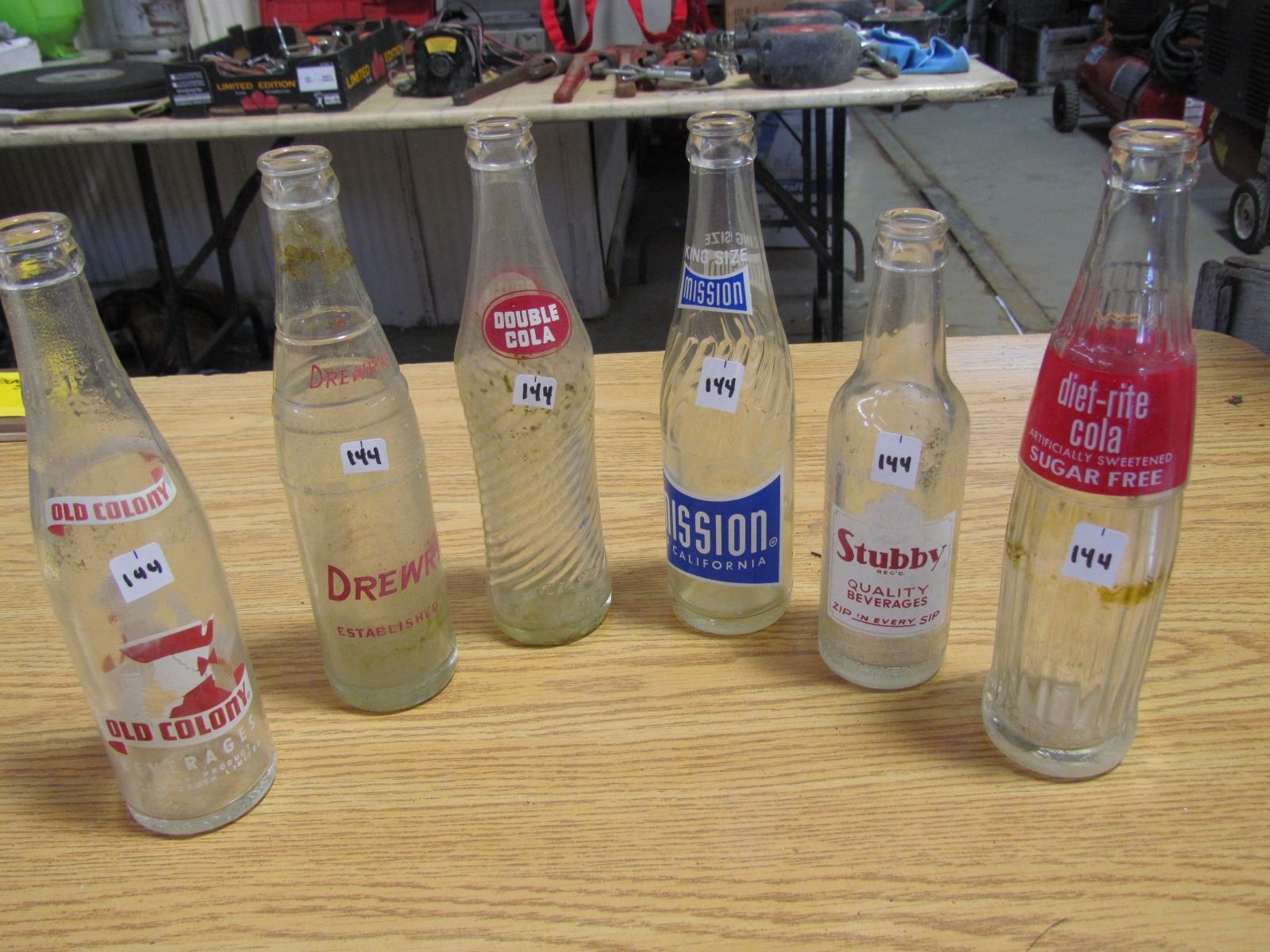 6 Pop bottles, Old Colony, Drewerys. Double Cola, Mission, Stubbys, diet rite Cola