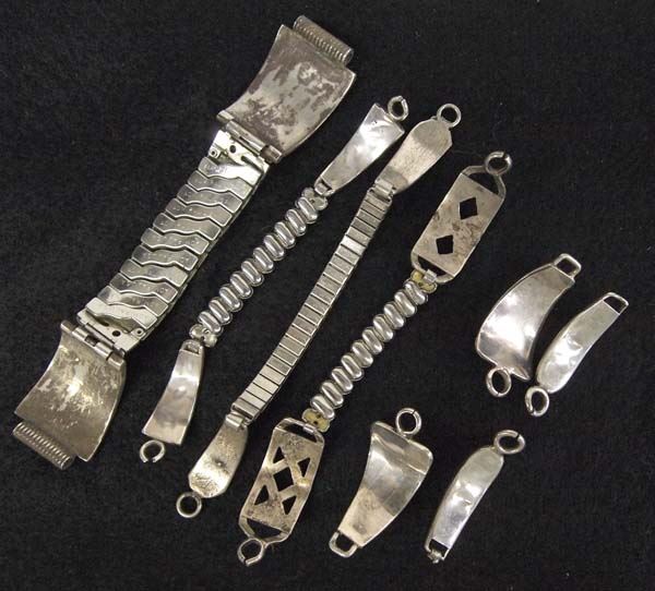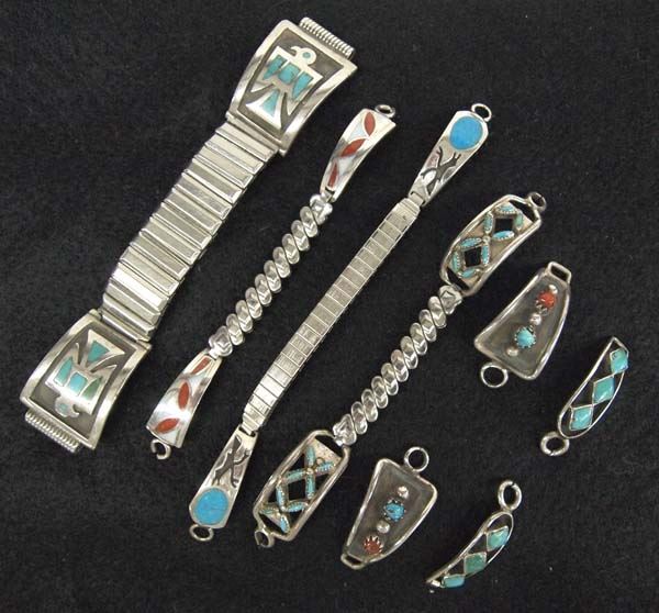6 Pr Native American Zuni and Navajo Sterling Watch Band Tips, largest tips measure 1 1/8'' x 1'', includes: Navajo Thunderbird, Zuni Mother of Pearl and Coral Inlay, Zuni Petit Point, Navajo Roadrunner, Zuni Turquoise, and Navajo Turquoise & Coral