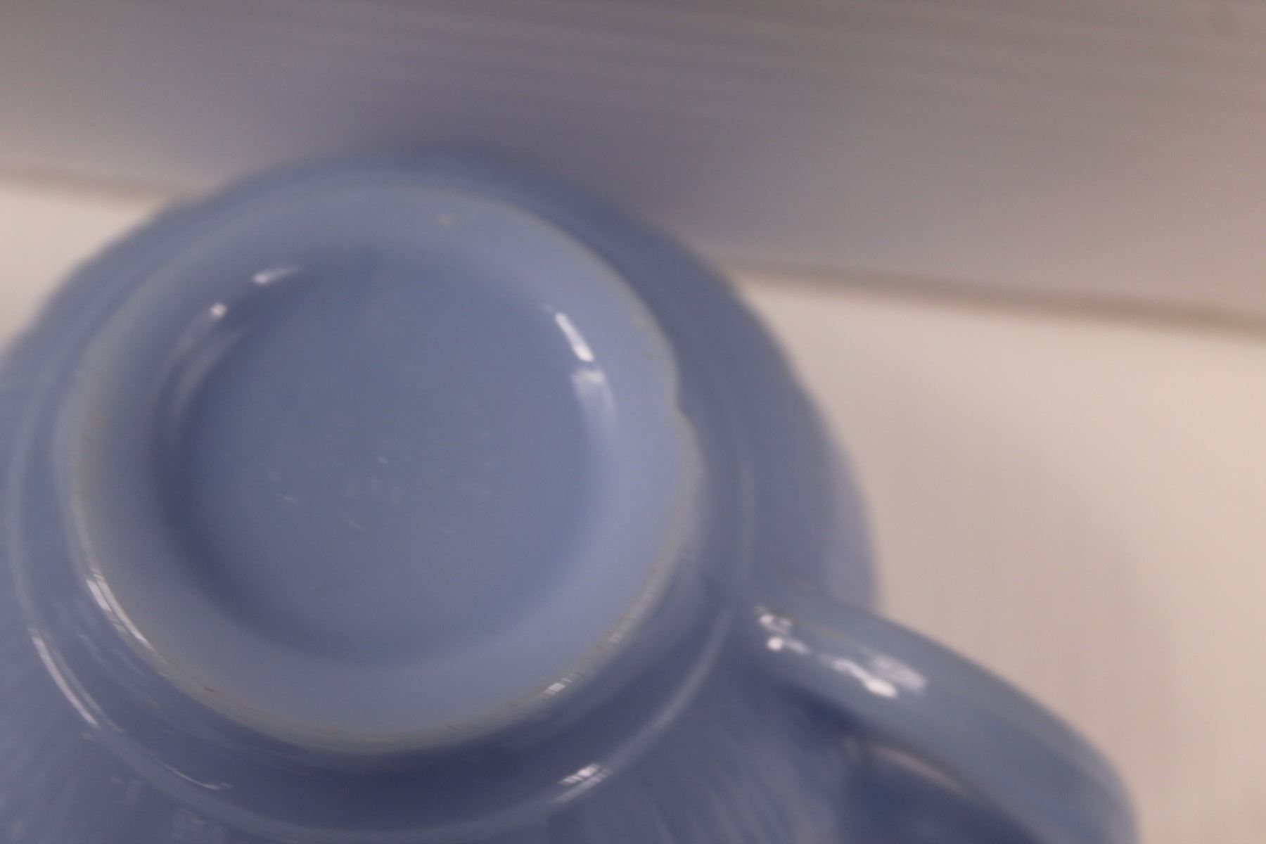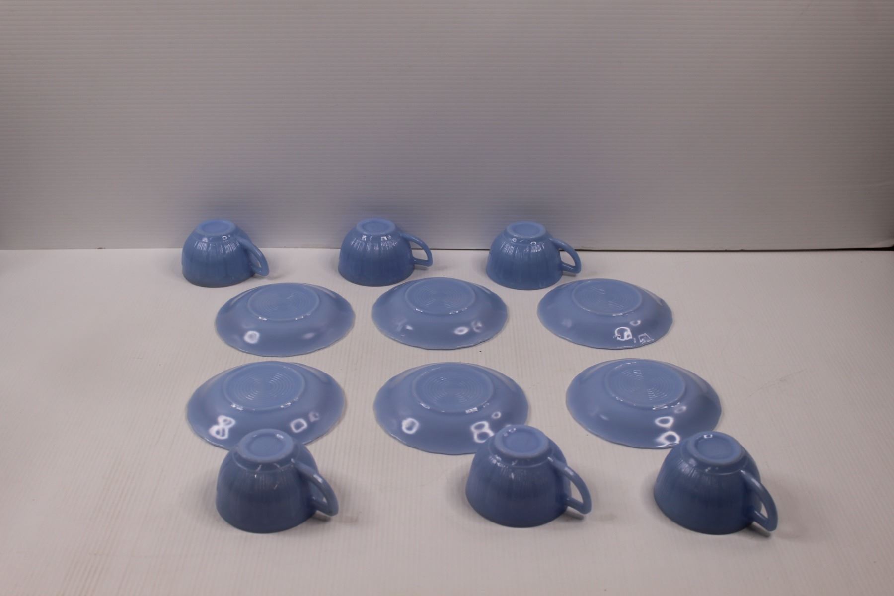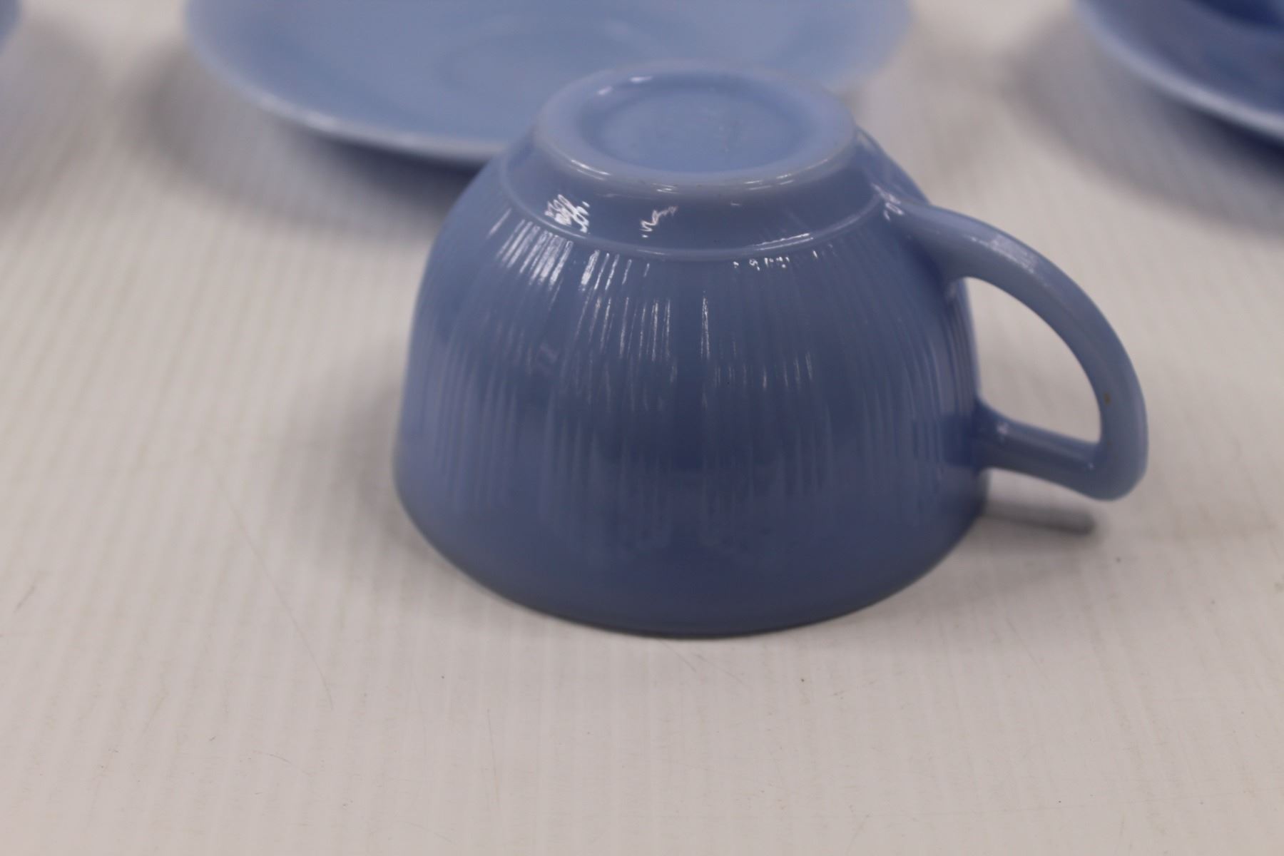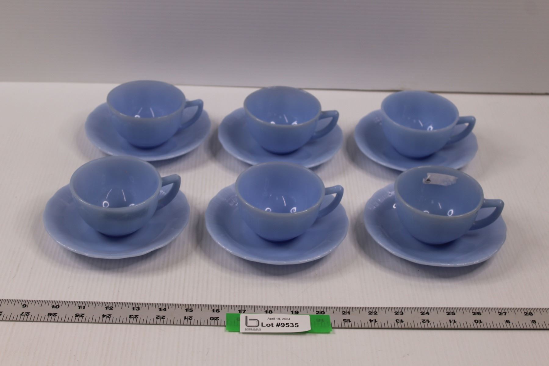 (6) Pyrex Delphite Blue Tea Cups & Saucers - One Cup Has Chip On Bottom