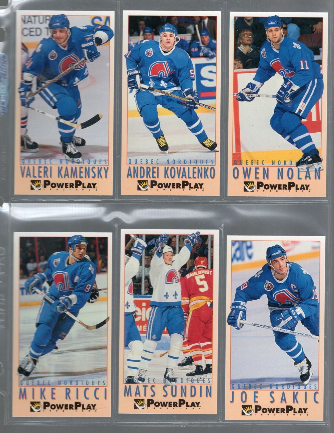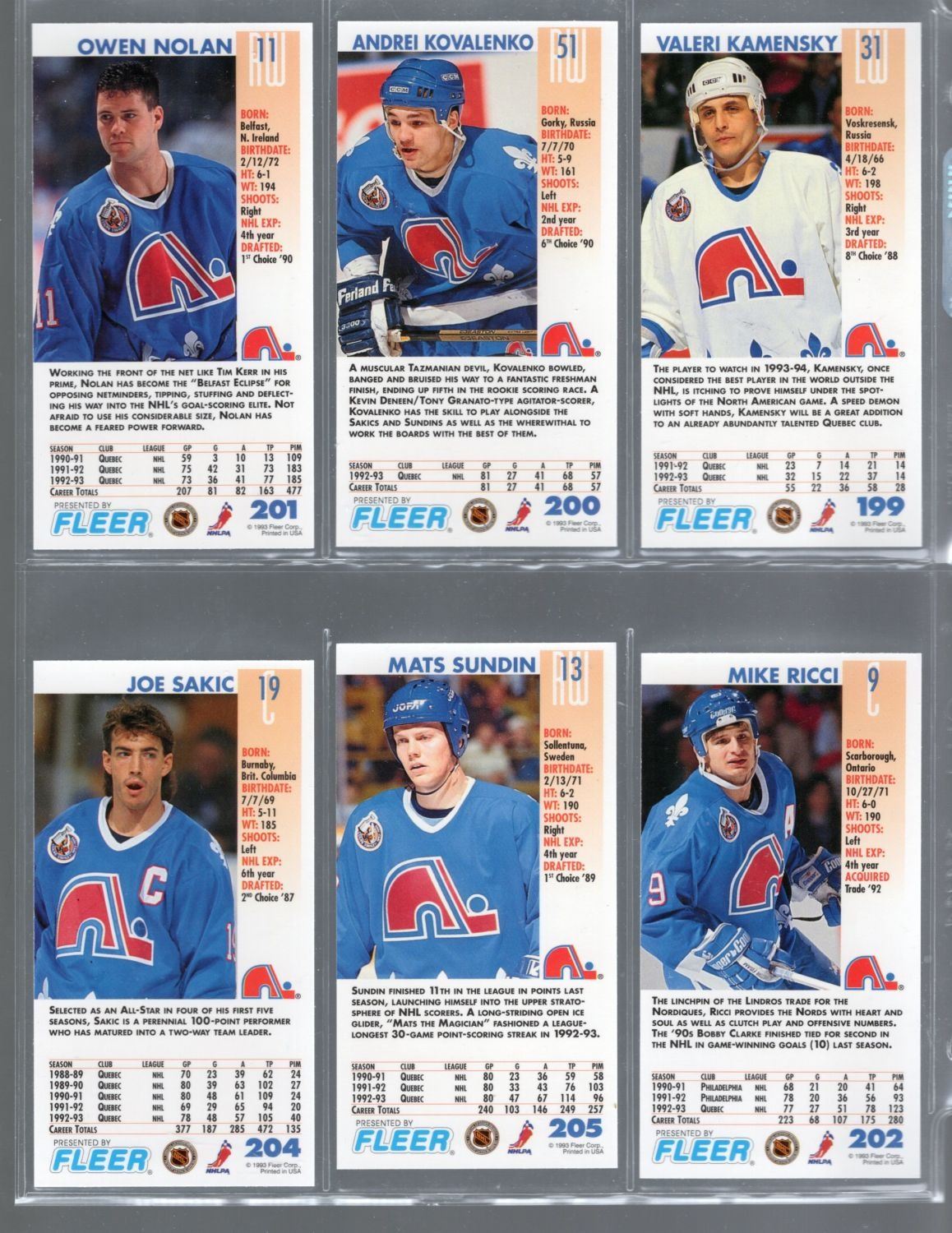 6 Quebec Nordiques Cards!!! Remember they moved from Quebec to Colorado in 1995. Joe Sakic, Owen Nolan, Mats Sundin, Mike Ricci, Valeri Kamensky, Andrei Kovalenko.