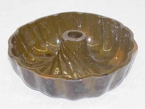 6" REDWARE TURKS HEAD FOOD MOLD W/ DARK GREEN GLAZE - TINY RIM CHIPS;