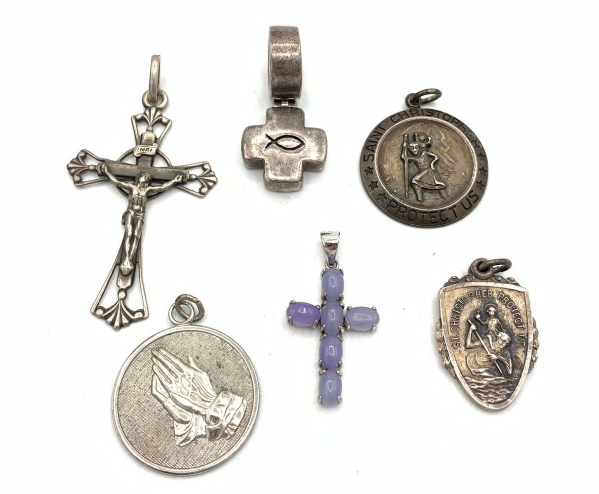 6 RELIGIOUS PENDANTS CROSS, PRAYER HANDS ETC