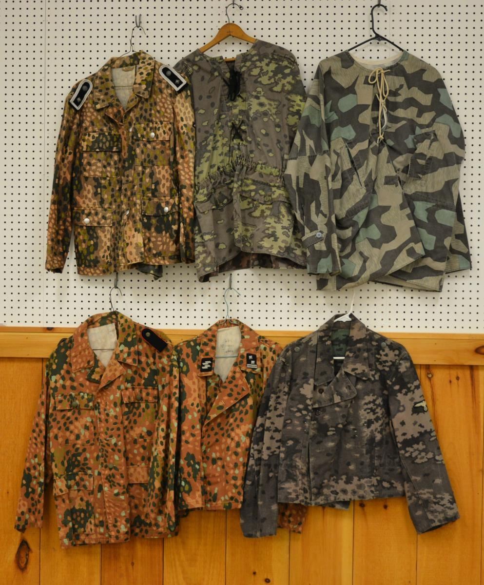 4 Of the tunics have SS sleeve eagles. 3 Have shoulder straps or collar tabs, all of which are reproduction. Please see photos for specific camouflage patterns. CONDITION: all tunics show light wear. (02-13522/BF). $300-500.