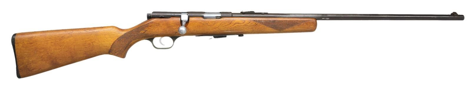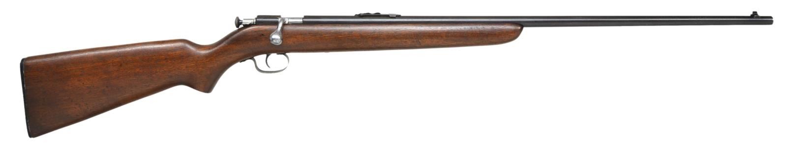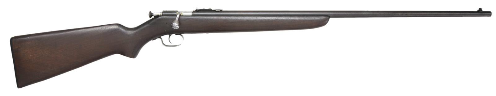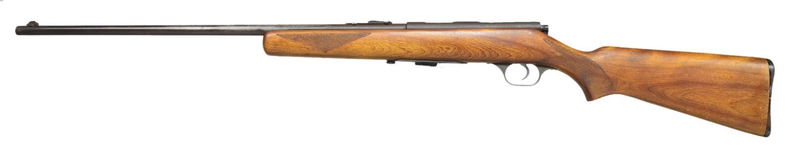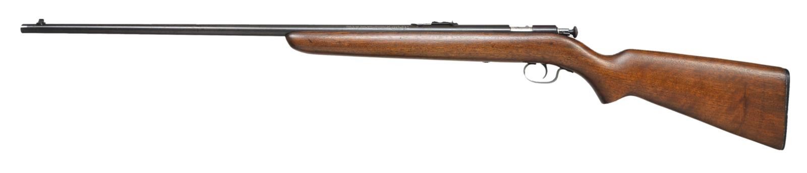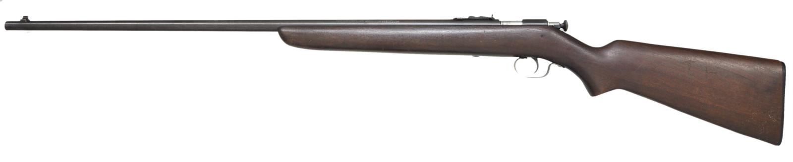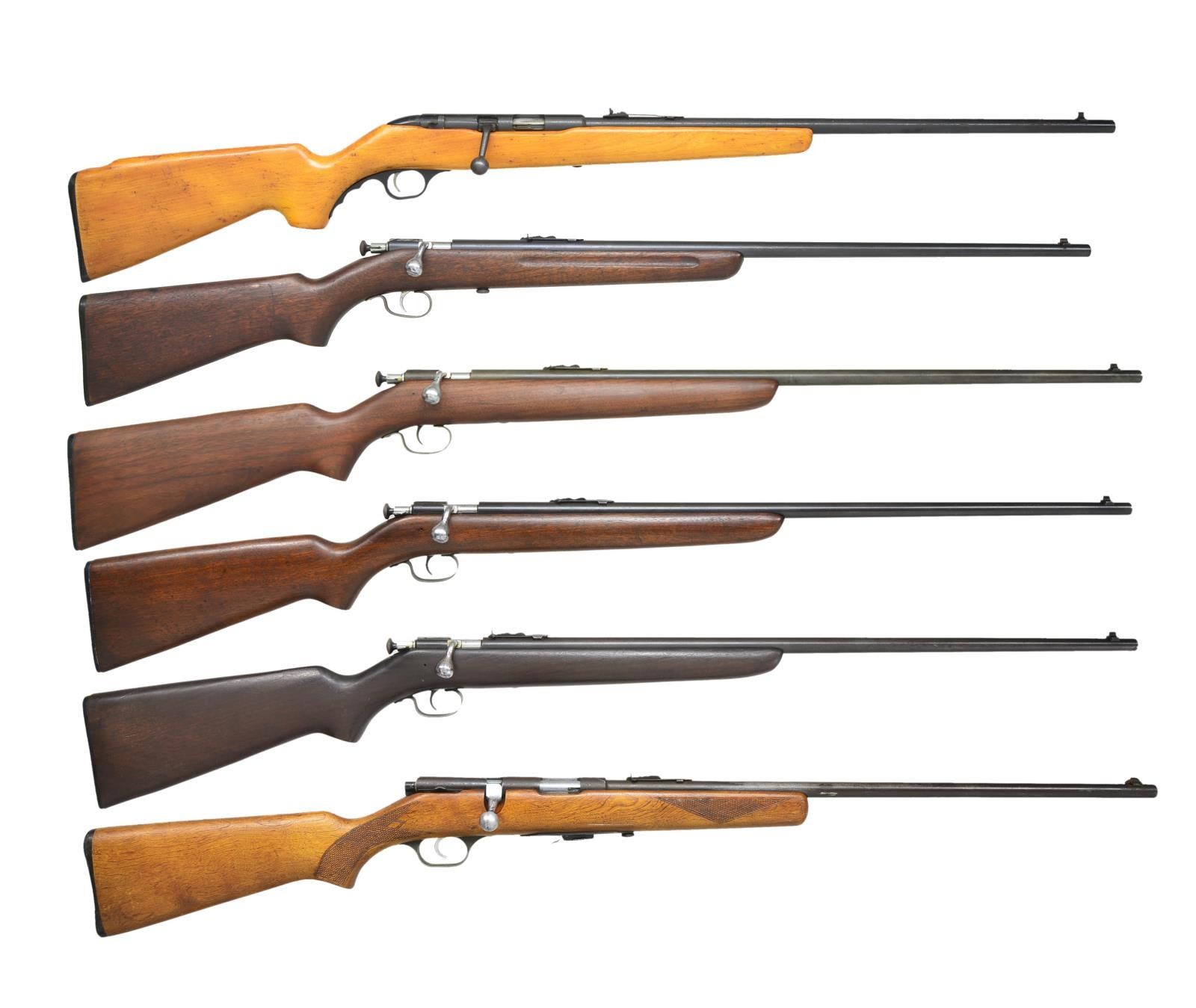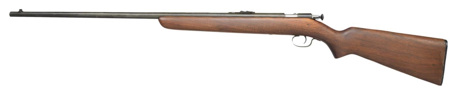 ALL: cal. 22 S, L, LR. NSN. 1) MOSSBERG 320KA SINGLE SHOT. Bbl.24" w/ bead front sight & elevator adj. rear sight. Receiver is grooved for tip off scope mts. Single shot action. Monte Carlo hardwood pistol grip stock w/ plastic trigger guard & buttplate. CONDITION: metal shows extensive light surface corrosion. Stock has worn finish showing numerous dents, scratches & marks. Bright bore w/ strong rifling. (21-441/DS). 2) WINCHESTER 67 SINGLE SHOT. Bbl. 27" w/ blade front sight & elevator adj. rear sight. Chrome plated bolt & trigger. Finger grooved pistol grip walnut stock w/ original buttplate. CONDITION: 70% dull worn blue showing spots of freckling. Bolt & trigger retain 70% chrome showing spots of finish loss. Stock has dark worn appearance w/ numerous scratches, dents & marks. Bore is bright w/ lightly worn rifling. (21-448/DS). 3) WINCHESTER 67A SINGLE SHOT. Bbl. 27" w/ bead front sight & elevator adj. rear sight. Chrome plated bolt. Pistol grip walnut stock w/ original buttplate. CONDITION: blue has dull gray coloration indicating touch up finish & showing spots of corrosion. Sanded & refinished stock has satin finish showing scratches, dents & marks. Bore retains lightly worn rifling. (21-450/DS). 4) WINCHESTER 67A SINGLE SHOT. Bbl. 27" w/ bead front sight & elevator adj. rear sight. Chrome plated bolt. Pistol grip walnut stock w/ original buttplate. CONDITION: 70% dull worn blue. Chrome bolt retains 50% finish. Stock has dark worn appearance showing scratches & marks. Bore retains lightly worn rifling. (21-451/DS). 5) WINCHESTER 67 SINGLE SHOT. Bbl. 27" w/ bead front sight & replacement elevator adj. rear sight. Chrome plated bolt. Pistol grip walnut stock w/ original buttplate. Left side has hand carved initials "T.H.". CONDITION: 70% dull worn blue. Stock has age darkened appearance showing scratches & marks. Bore has worn rifling showing scattered pitting. (21-453/DS). 6) SPRINGFIELD 84C REPEATER. Bbl. 24" w/ bead front sight & elevator adj. rear sight. Chrome plated bolt & trigger. Pistol grip walnut stock w/ hand checkering & original buttplate. MAGS: 1 detachable 5 rd. CONDITION: blue has faded to gray / brown showing surface corrosion. Stock shows heavy wear w/ scratches, dents & marks. Bore has lightly worn rifling showing spots of very light pitting. (21-566/DS). ALL CURIO. $700-1,000.