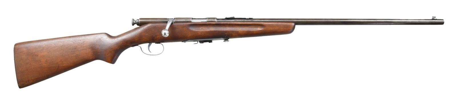 1) SPRINGFIELD MODEL 56 BOLT ACTION. Cal. 22 S, L & LR. NSN. Bbl. 24". Elevator adj. rear sight. Gold bead front sight. Rear left of receiver has vacant screw hole. Turned down bolt handle. Pistol grip stock. Left rear of stock notched likely for an aperture sight. MAGS: 1-5 rd. CONDITION: sanded stock set shows scattered handling wear & dings. Metal is mostly a gray patina w/ scattered oxidation. Very good bore. (23-1564/MJC). 2) UNITED ARMS CO YOUTH MODEL BOLT ACTION. Cal. 22 RF. NSN. Bbl. 19 1/2". Single shot German made Boys style rifle that partially resembles an M1 Carbine. Imported by United Arms Co. of Chicago. V notch rear sight. Tall blade front sight. Pistol grip beech stock. CONDITON: stock has added varnish w/ a round plug on left side, scattered flaking, scratches & handling wear. Metal retains 30% original blue w/ overall fading to brown & some light oxidation. Good bore w/ some frosting & light pitting. (23-1577/MJC). 3) NOBLE 33A PUMP ACTION. Cal. 22 S, L & LR. NSN. Bbl. 24". Elevator adjustable rear sight. Gold bead front sight. Left rear of receiver has two screw holes. Pistol grip stock & grooved forend. CONDITION: stock shows a large glue repaired crack at front left, some dings & scattered handling marks. Metal retains 70% blue w/ operational wear, some freckling & fading. Good bore. (23-1579/MJC). 4) GECO MODEL 1919 BOLT ACTION. Cal. 22 LR. S# 110n. Bbl. 23". German made single shot bolt action rifle. Fixed rear sight. Bead front sight. Pistol grip stock. CONDITION: refinished stock w/ added varnish, a 2 1/2" crack behind cocking piece, a smaller crack on left side of butt & scattered handling wear. Metal is turning to a brown patina w/ scattered traces of bluing. Worn pitted bore. (23-1598/MJC). 5) HOBAN MODEL 45 BOLT ACTION. Cal. 22 S, L & LR. NSN. Bbl. 19". Single shot military style bolt action Boys Rifle. Elevator V notch rear sight. Tall blade front sight. Elm semi pistol grip stock w/ left side sling studs & vacant hole on bottom of butt. CONDITION: stock shows scattered handling wear & dings. Metal retains 50% original blue w/ overall fading, some silvering & oxidation. Worn bore w/ frosting & oxidation. (23-1601/MJC). 6) PREMIER PUMP ACTION. Cal. 22 S, L & LR. S# 8906K. Bbl. 24". Elevator adjustable V-notch rear sight. Bead front sight. Pistol grip stock & grooved forend. CONDITION: stock has a crack extending from behind trigger guard into wrist, a chip near upper tang, scattered handling wear, staining & flaking. Metal is a gray patina w/ overall oxidation & scattered traces of original blue. Good bore w/ some light frosting. (23-1612/MJC). ALL CURIO. $450-800.