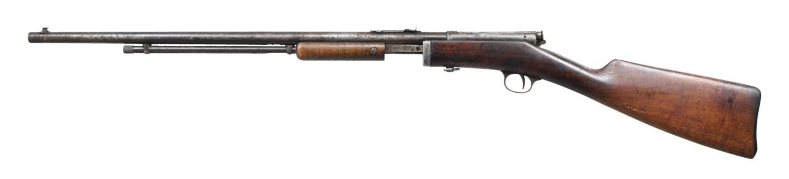 1) STEVENS GALLERY NO. 80 PUMP ACTION RIFLE. Cal. 22 S, L & LR. S# 26744. Bbl. 24". Elevator notch rear sight. Bead front sight. Straight walnut stock & grooved forend. Action is stiff. CONDITION: walnut stock shows several large cracks at front, a few chips scattered handling wear & dings. Metal is a gray patina w/ some light pitting & overall oxidation. Worn dark bore. (23-1562/MJC). 2) CONTINENTAL ARMS BOLT ACTION RIFLE. Cal. 22 S, L & LR. NSN. Bbl. 24". Single Shot bolt action rifle. Fixed v notch rear sight. Bead front sight. Pistol grip hardwood stock. CONDITION: stock shows overall flaking, scattered staining & handling wear. Metal retains 50% original blue w/ receiver turning silvery gray, scattered oxidation & edge wear. Poor pitted bore. (23-1569/MJC). 3) IVER JOHNSON MODEL X BOLT ACTION RIFLE. Cal. 22 S, L & LR. NSN. Bbl. 22". Single shot bolt action rifle. Fixed U-notch rear sight. Blade front sight. Pistol grip walnut stock. Action does not appear to be cocking correctly & may require attention. Metal parts display a loose fit w/ stock. CONDITION: stock has added varnish w/ some dings & handling marks. Metal is mostly a dull gray patina w/ scattered oxidation & traces of original blue. Fair bore w/ scattered pitting but evident rifling. (23-1574/MJC). 4) HOPKINS & ALLEN MODEL 4922 BOLT ACTION RIFLE. Cal. 22 RF. NSN. Bbl. 22". Tube fed, takedown bolt action rifle. Buckhorn rear sight. Bead front sight. Straight grip walnut stock. CONDITION: sanded stock shows a few chips, stains, cracks, glue repairs & handling wear. Metal is a silvery oxidized patina. Fair bore w/ scattered frosting & pitting. (23-1575/MJC). 5) PREMIER SINGLE SHOT BOLT ACTION RIFLE. Cal. 22 S, L & LR. NSN. Bbl. 22". Elevator adjustable rear sight. White bead front sight w/ broken bead. Pistol grip walnut stock. CONDITION: refinished stock has added varnish w/ scattered flaking, dings & handling wear. Metal is mostly a gray patina w/ scattered traces of original blue, varnish overruns & some oxidation staining. Good bore w/ scattered frosting & light pitting but strong rifling. (23-1585/MJC). 6) PAGE LEWIS ARMS MODEL D BOLT ACTION RIFLE. Cal. 22 LR. S# 20270. Bbl. 20". Single shot bolt action rifle. Fixed U-notch rear sight. Blade front sight. Straight grip stock. Bolt not going into battery properly & will likely require attention. CONDITION: refinished stock w/ added varnish, a couple repairs on the right side of receiver & scattered handling wear. Metal is mostly a mottled gray patina w/ scattered oxidation staining. Fair bore w/ scattered pitting but strong rifling. (23-1603/MJC). ALL CURIO. $300-600.