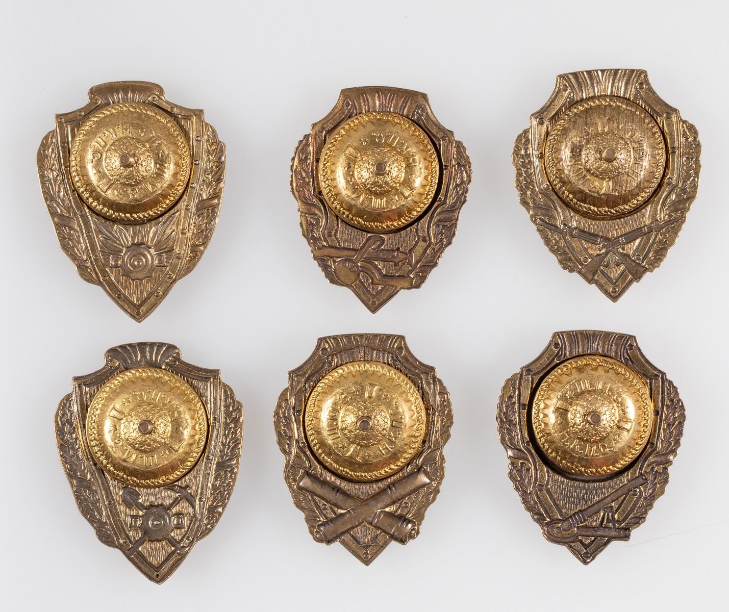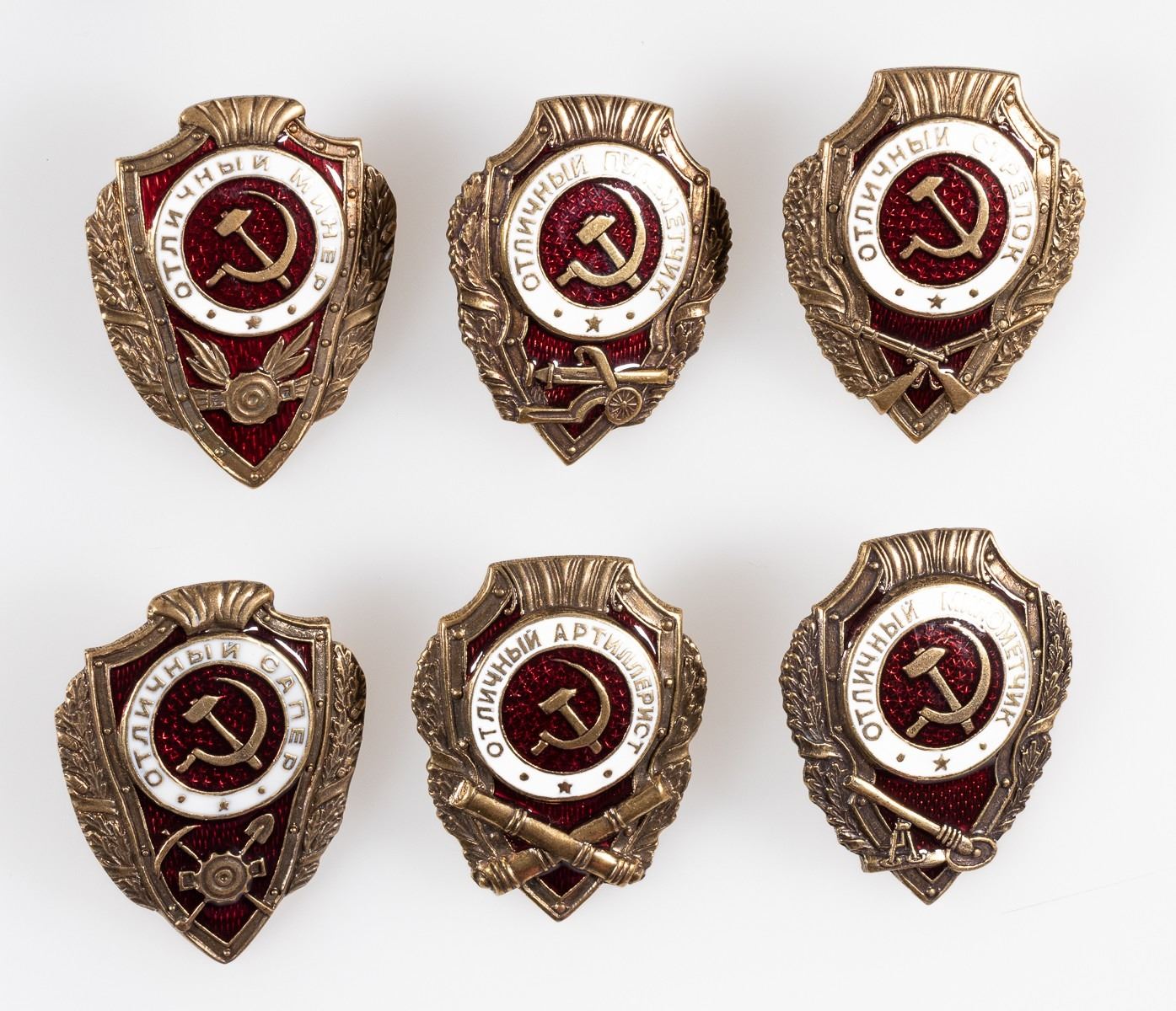 Lot of six Russian service badges for 'Distinguished Machine Gunner', 'Distinguished Artilleryman', 'Distinguished Infantryman', 'Distinguished Miner', and two 'Distinguished Sapper' badges. Approx. 2 inches. Screw-back design. Collector's copies.