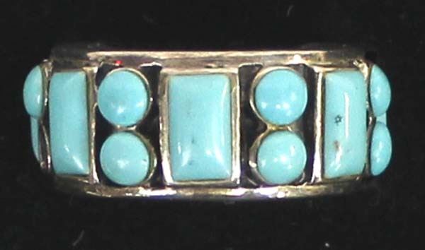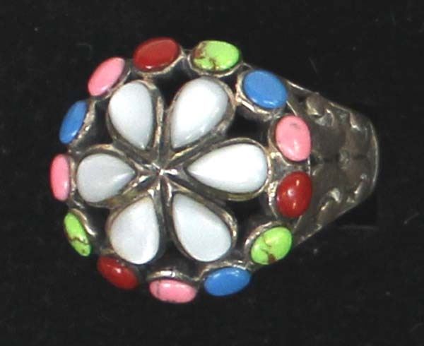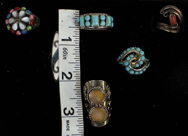 6 Rings, Some Sterling, Various Sizes, 1. Multi-Stone Dome Ring, size 7.5 and is stamped .925 2. Turquoise Band, size 8 and is stamped .925 3. Coral Ring, adjustable size and is stamped .925 4. Turquoise Chip Inlay Ring, size 7.25 and is stamped .925 5. Trifari Turquoise Ring, size 6.5 6. Agate Ring, size 7
