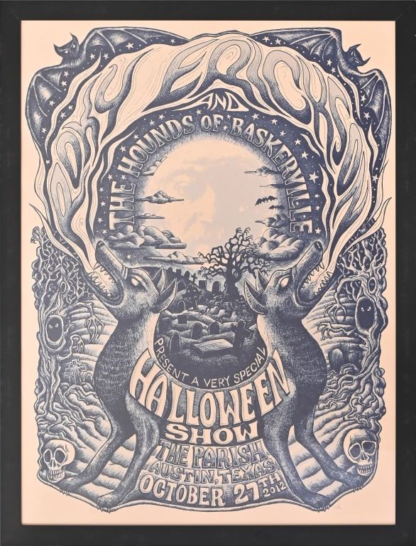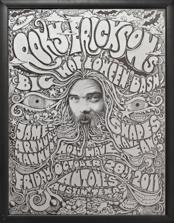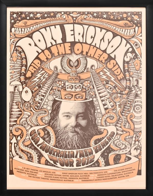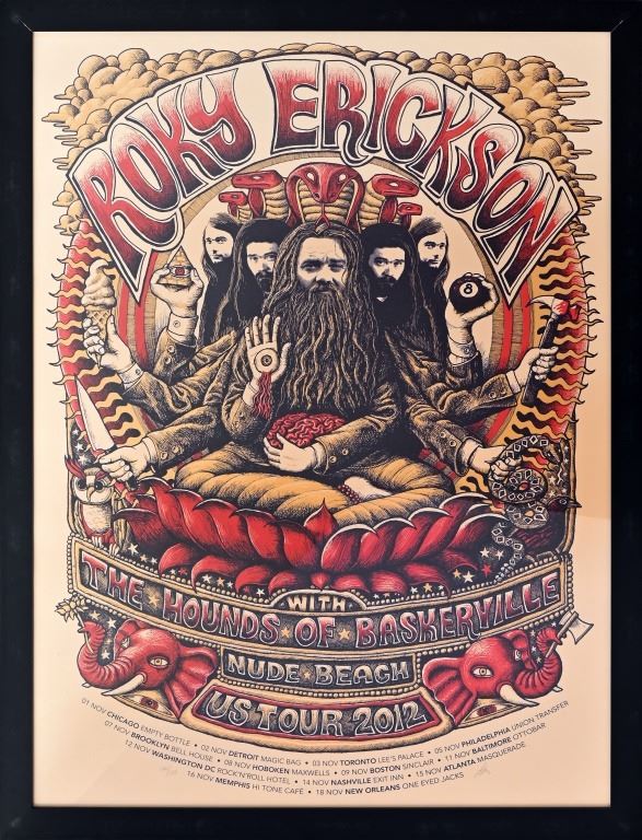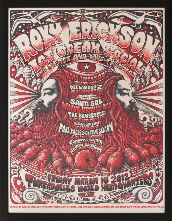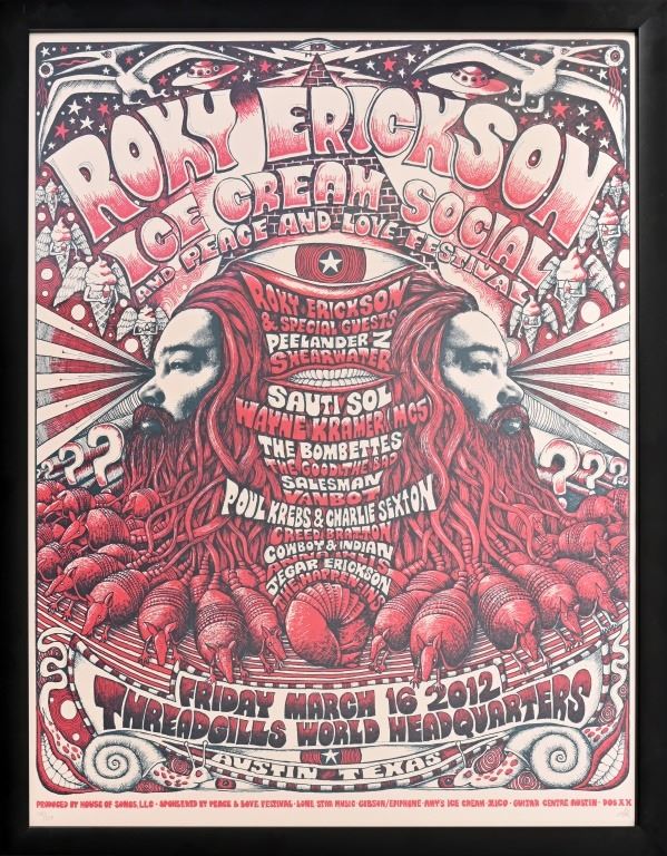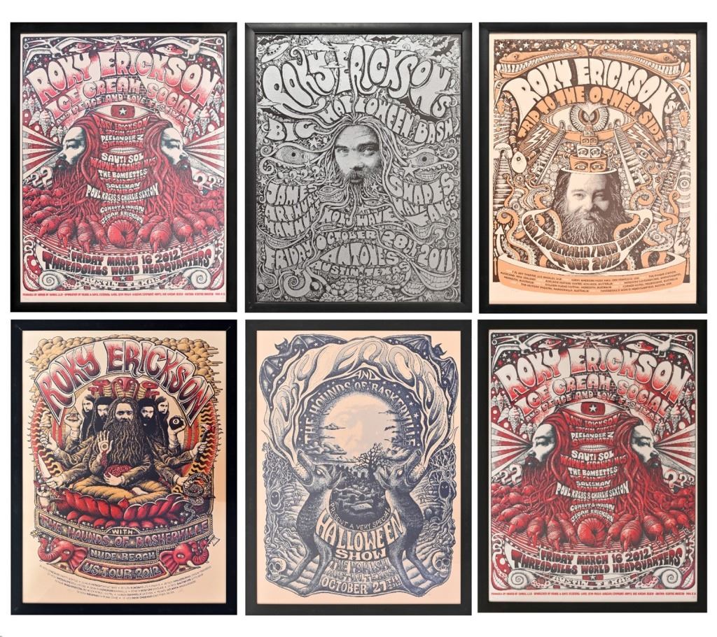 Roky Erickson 2012 Tour Limited Edition Poster, Nude Beach Tour 2012. Poster art by Mishka Westell, Limited Edition 154/268, 18x24; Roky Erickson "Trip To The Other Side" Tour Poster, Poster art by Mishka Westell, Limited edition 206/300, 20x26; Roky Erickson Parish Austin Texas Poster, Roky Erickson and the Hounds of Baskerville. Parish Austin Texas poster by Mishka Westell, limited edition 58/120, 18 x 24; Roky Erickson Ice Cream Social Poster 2012, Threadgill's World Headquarters, poster art by Mishka Westell, Limited Edition 134/250, 20 x 26; Roky Erickson Ice Cream Social Poster 2012, Threadgill's World Headquarters, poster art by Mishka Westell, Limited Edition 133/250, 20 x 26; Roky Erickson Antone's Halloween Bash Poster, Limited Edition 38/100, Poster artwork by Mishka Westell. 20x26.