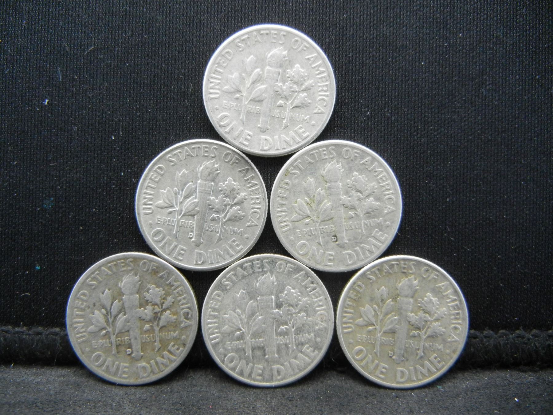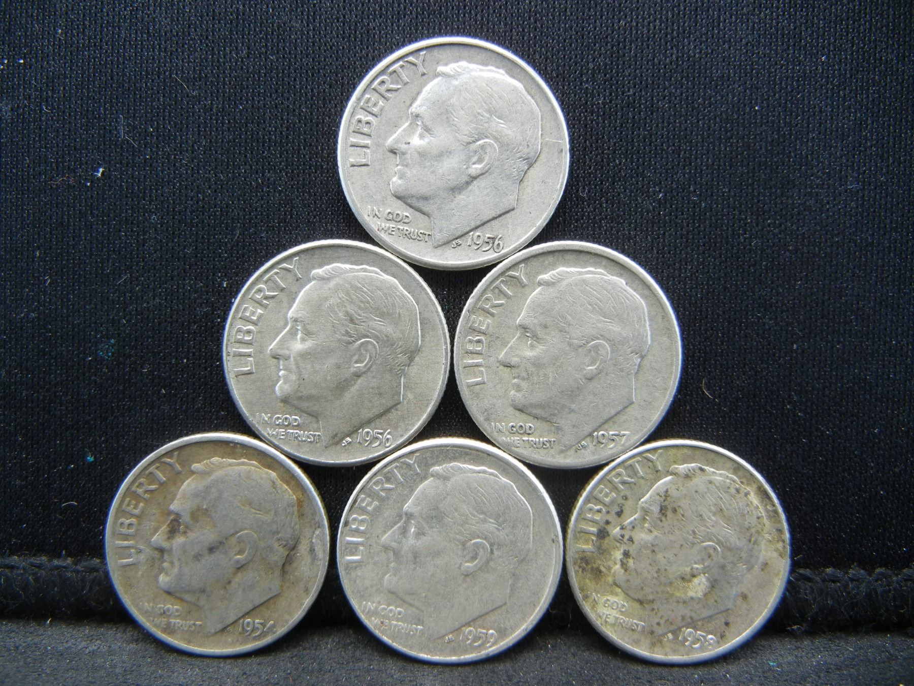 (6) Roosevelt Dimes, 50's, Some Mint Marks