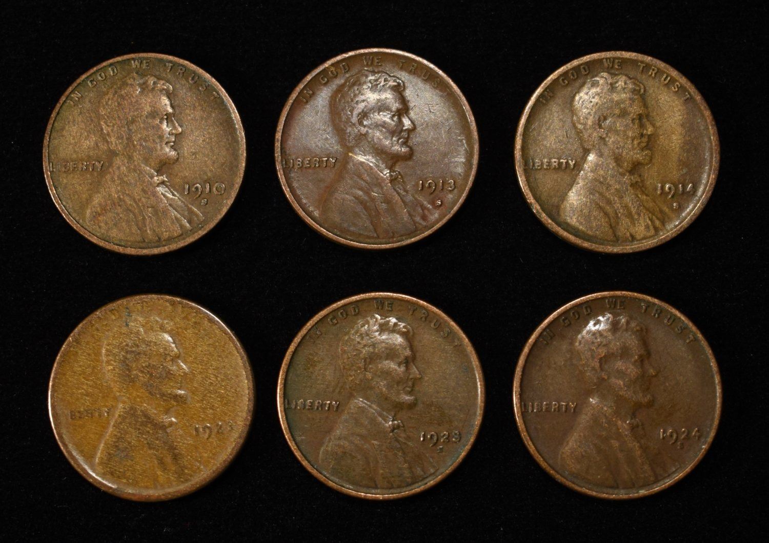 1910-S, 1913-S, 1914-S, (2) 1923-S & 1924-S LINCOLN WHEAT CENT ESTIMATE $80 - $120.