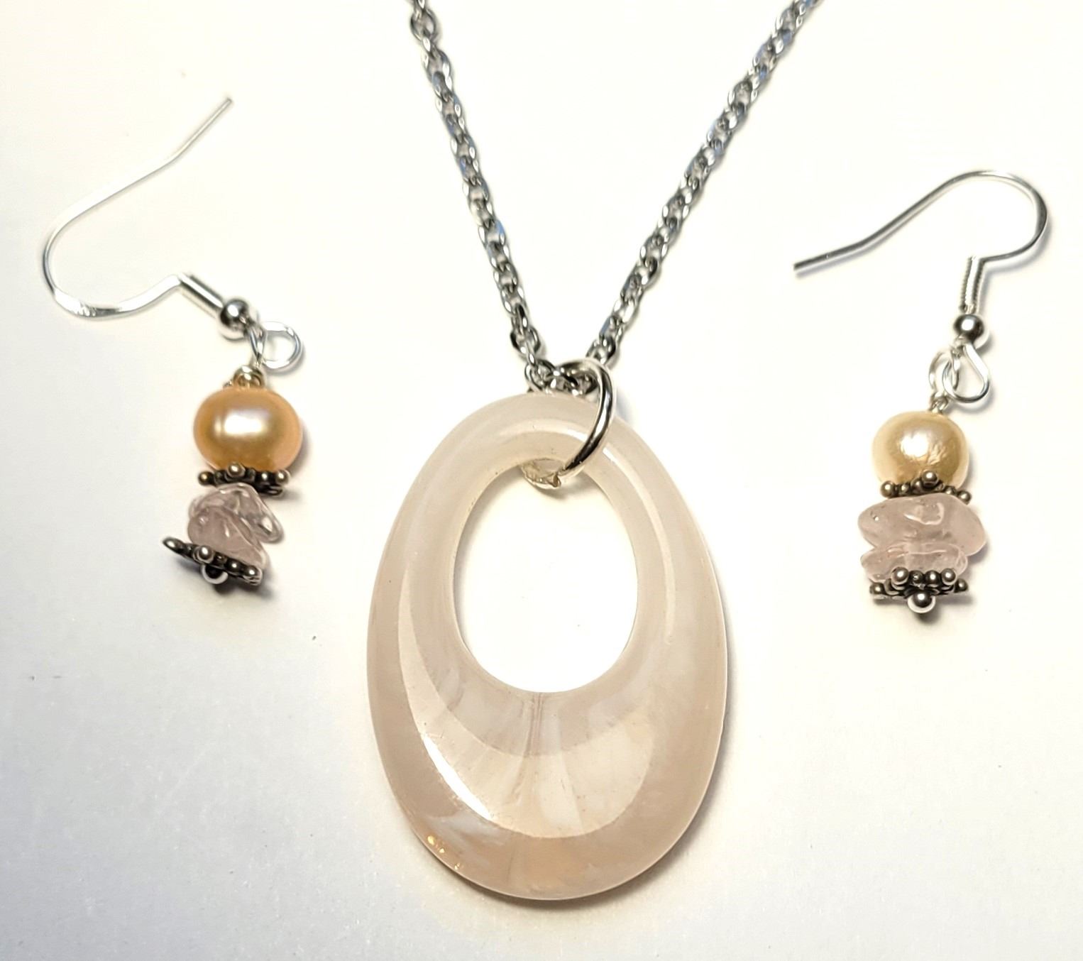 WATER PEARL, FEATURING A DONUT PENDANT ON A SILVER TONE 20" CHAIN AND DROP EARRINGS FEATURING PEARL AND ROSE QUARTZ ON 925 STAMPED WIRES