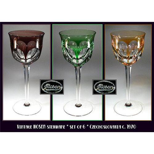 Gorgeous set of six facet cut wine goblets made by the "King of Glass" MOSER. These fabulous "POPE" stems are overlay cut to clear - in green, burgundy red/purple. Third color is hard to describe - it is pinkish/orange with faint hue of "vaseline" glass. There are 2 goblets of each color, each acid etch signed on the base with Moser logo (pictured). The set is still in its original presentation box, imprinted with MOSER - Czechoslovakia. MINT condition (never used), no chips, cracks or repairs. MOSER, Czechoslovakia circa 1970's, dimension just short of 8 inches high. Reference : MOSER Artistic Glass, second edition. Current retail price in the US is $300 per stem - or $1800 for set of 6. Please note that for Ebay Live Auction only bids at or over $1200 will be succesfull and meet our reserve....