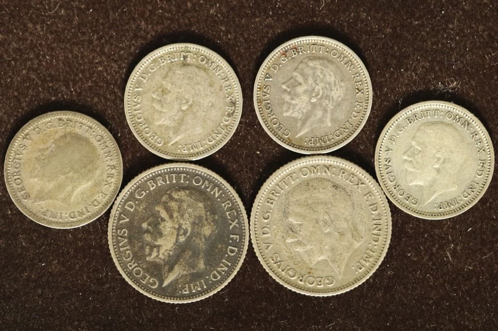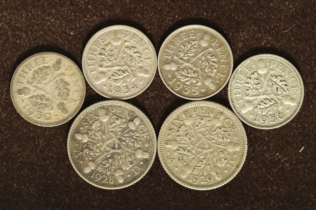 1936 THREE PENCE, 1928 AND 1929 SIX PENCE. .1591 OZ. ASW TOTAL