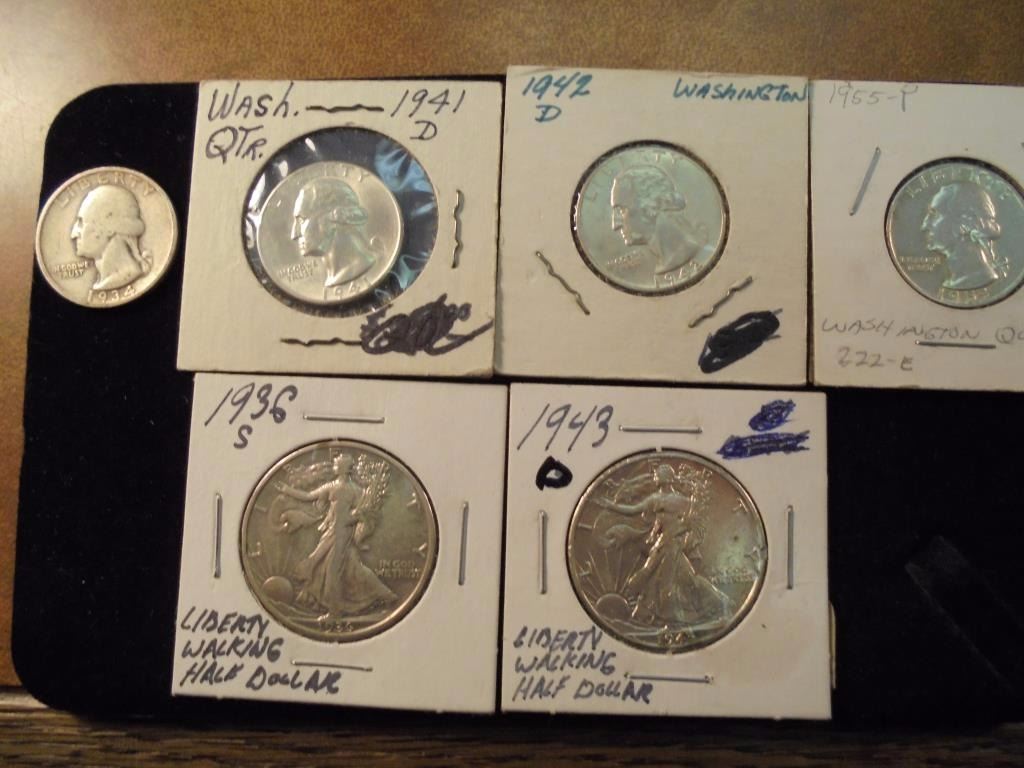 1936-S & 1943-D WALKING LIBERTY HALF DOLLARS, AND 1934, 1941-D, 1942-D & 1955 WASHINGTON SILVER QUARTERS. 6 COINS TOTAL.