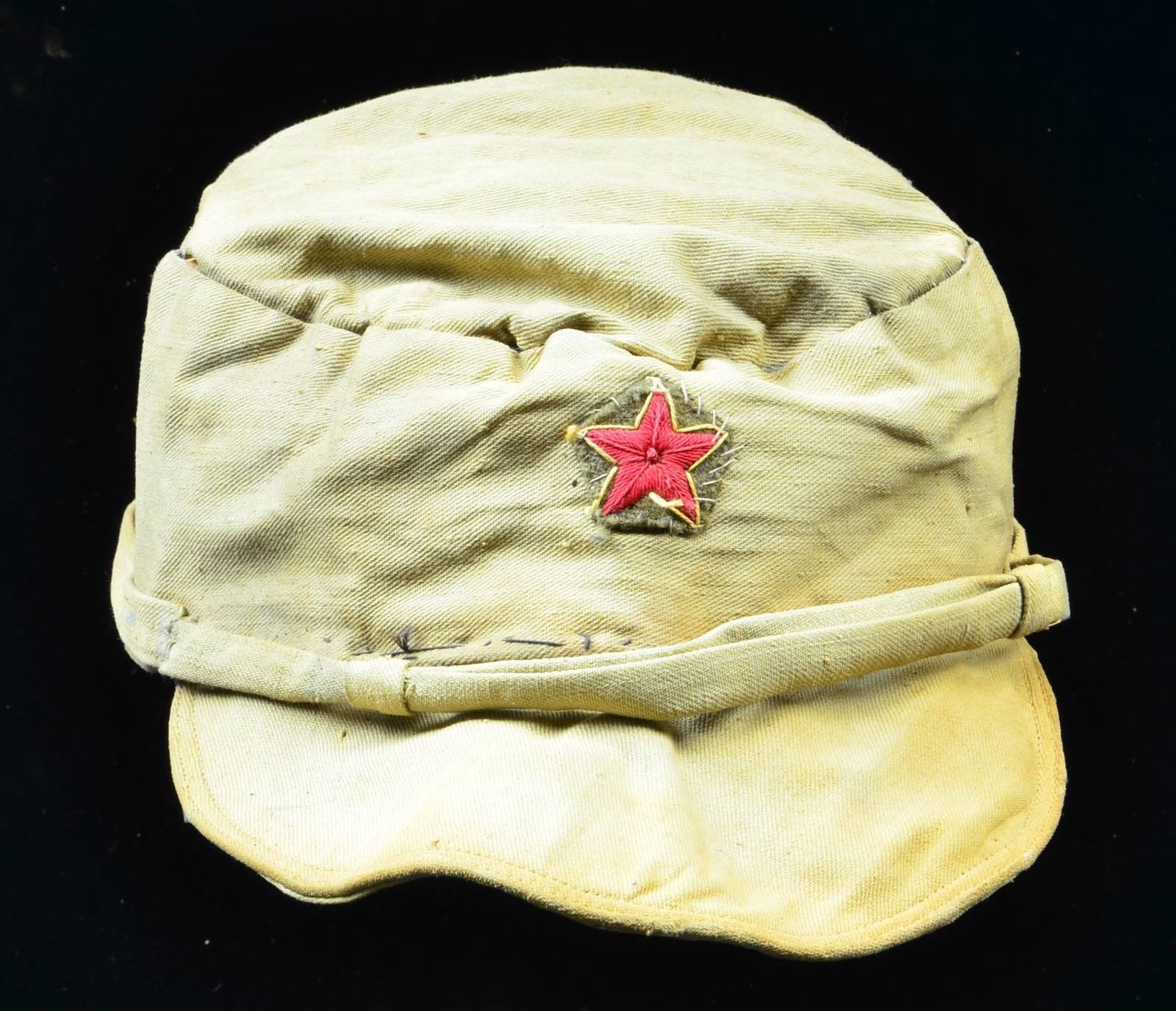 4) Tan cap w/ red star on front w/ khaki chin strap. Interior cloth liner. Brown leather rim marked "MADE EXPRESSLY FOR / Comas S.A. / BARCELONA. CONDITION: fair overall w/ staining, wear & loose stitching. Poor deteriorating cloth liner.