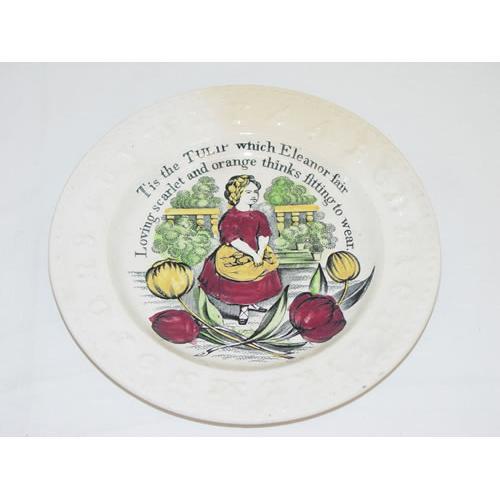 6" STAFFORDSHIRE ABC CHILDS PLATE W/ POLYCHROME DECORATION & MOTTO "T IS FOR TULIP WHICH ELEANOR FAIR, LOVING SCARLET & ORANGE, THINKS FITTING TO WEAR" - GLAZE CRAZING, STAIN, IMPERFECTIONS;