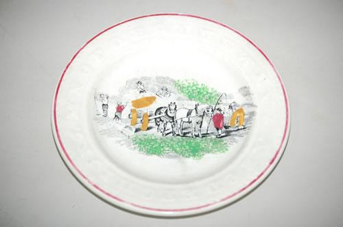 6" STAFFORDSHIRE TRANSFER CHILDS ABC PLATE - STAFFORDSHIRE TRANSFER PLATE W/ POLYCHROME HAY WAGON DECORATION-UNTITLED W/ ALPHABET & RED ROPED BORDER - CRAZING, LIGHT STAIN, IMPERFECTIONS