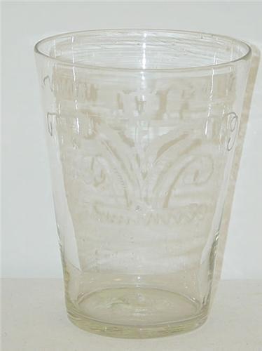 6" STIEGEL TYPE FLIP GLASS W/ ETCHED DECORATION OF POTTED FLOWERS W/ OPEN PONTIL (6" T X 4 1/2" DIA.) - NORMAL WEAR;