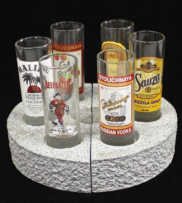 6 Shot Glass in Composition Holders, includes Malibu Caribbean White Rum with Coconut, Beefeater London Dry Gin, Kahlua Liqueur, Stolichnaya Russian Vodka, Sauza Tequila Gold, Stolichnaya Stoli Razberi (Raspberry Flavored Russian Vodka), glasses measure 4''H x 1.5''D, holders measure 7.5''D x 1.5''H and weigh about 3lbs.