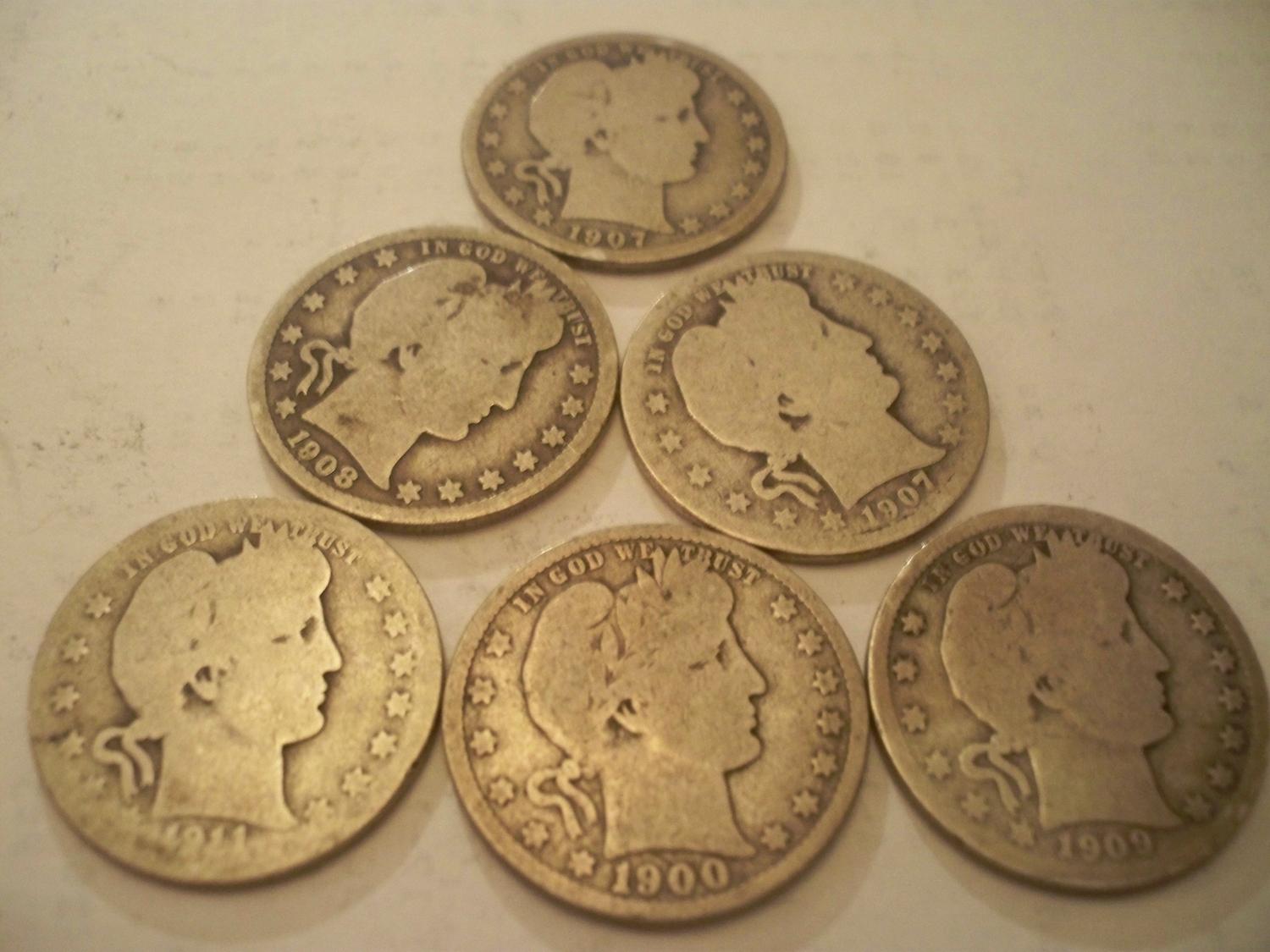 6 Silver Barber Quarters