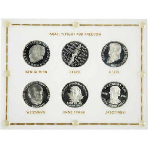 <B>Set of Six Silver Proof Medals, Israel's Fight for Freedom,</B></I> each 40mm, cased (7.5” x 5.75” overall. The coins feature David Ben Gurion, Peace, Theodor Herzl, Chaim Weizmann, Anne Frank, and Zeev Jabotinski. <I>Ex. Henry E. Luhrs Collection.</B></I> <B></B></I><BR><BR><b>Shipping:</b> Miscellaneous Collectibles, Smal (<a target="_blank" href="http://www.heritageauctions.com/common/shipping.php">view shipping information</a>)