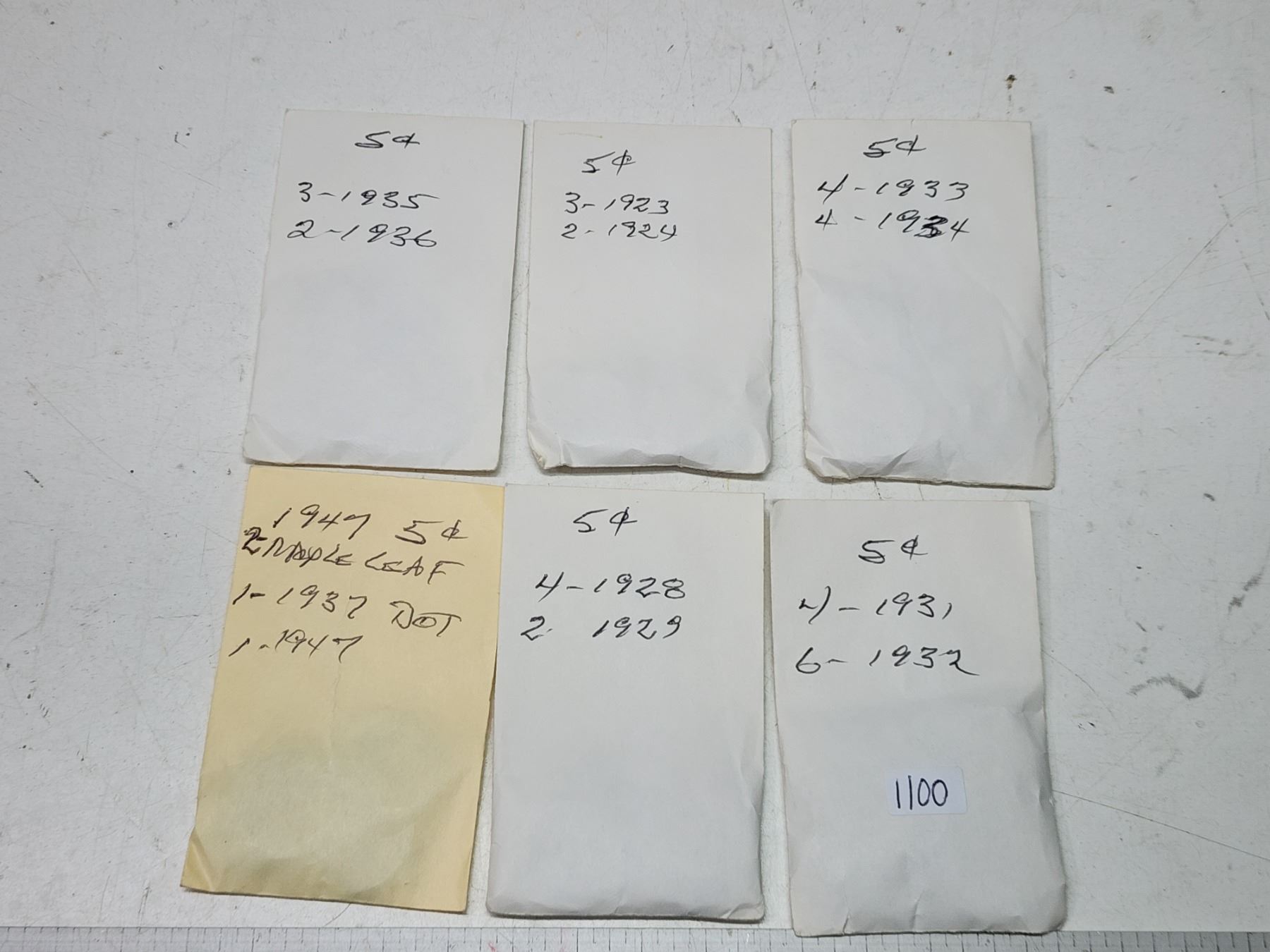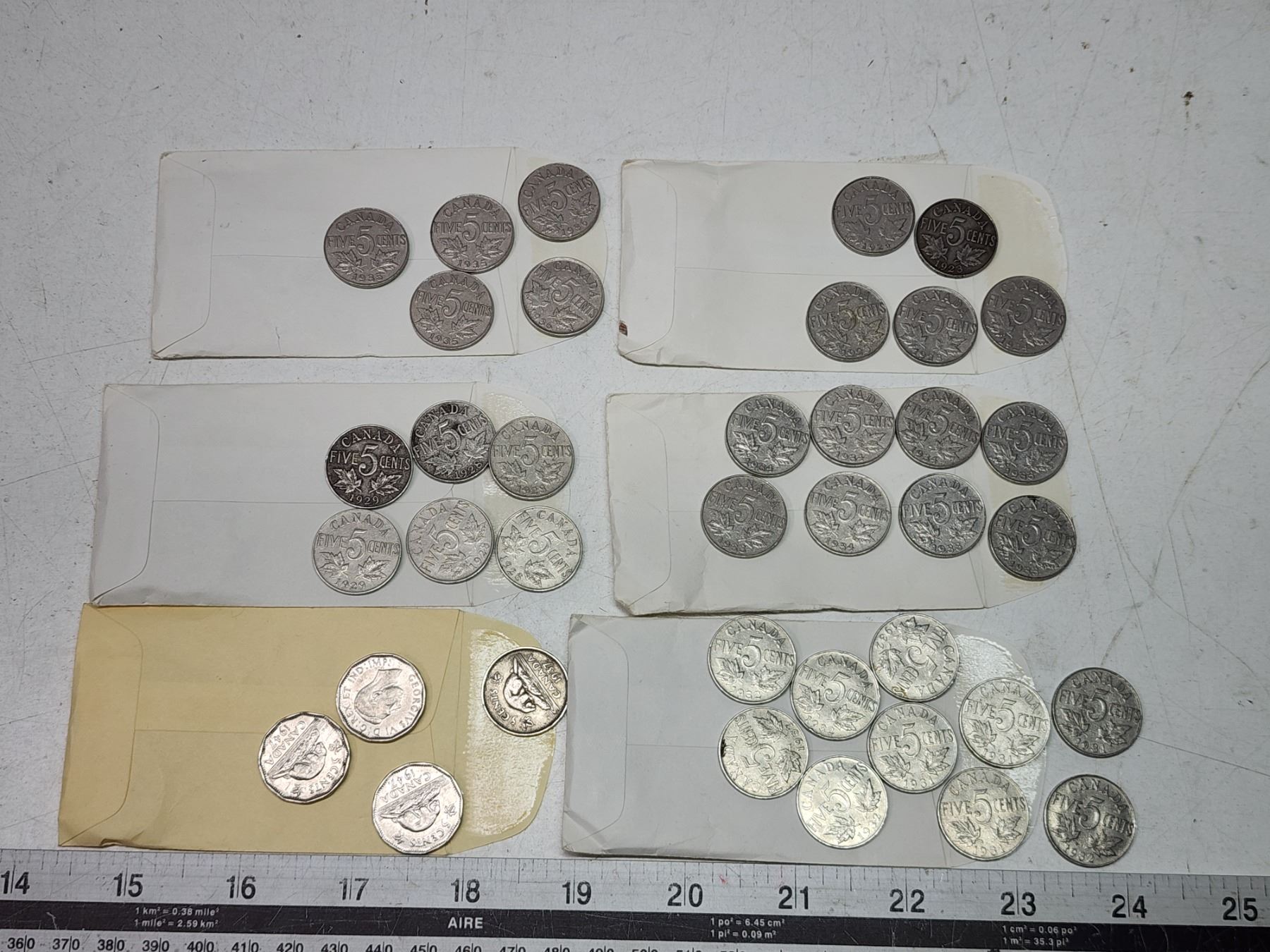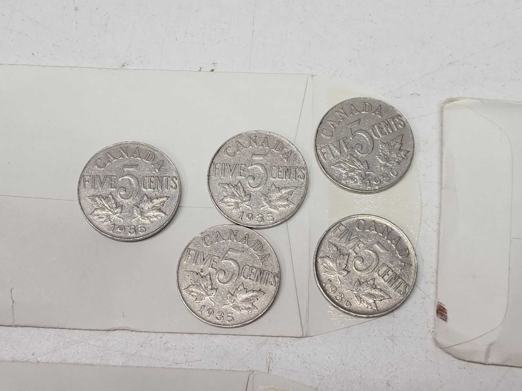 6 Small envelopes, w/ assorted Canadian 5 cent coins