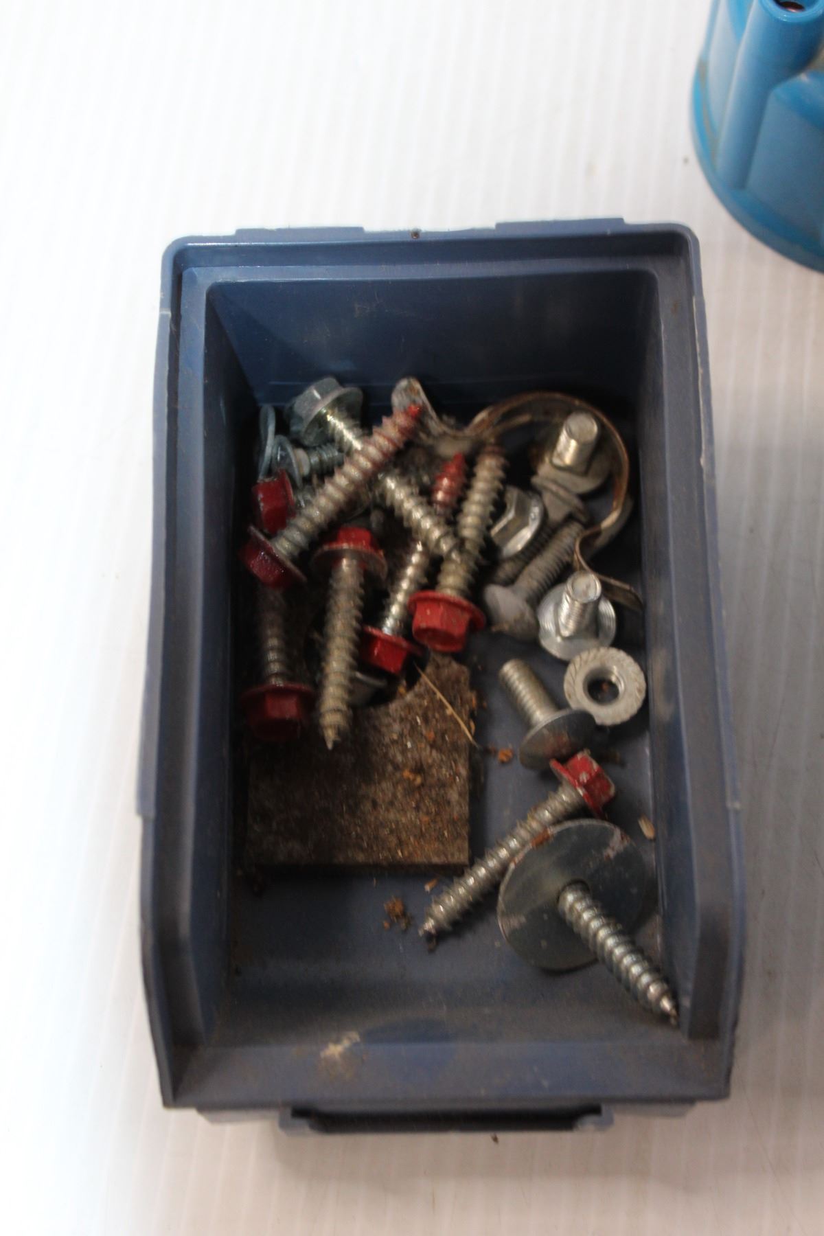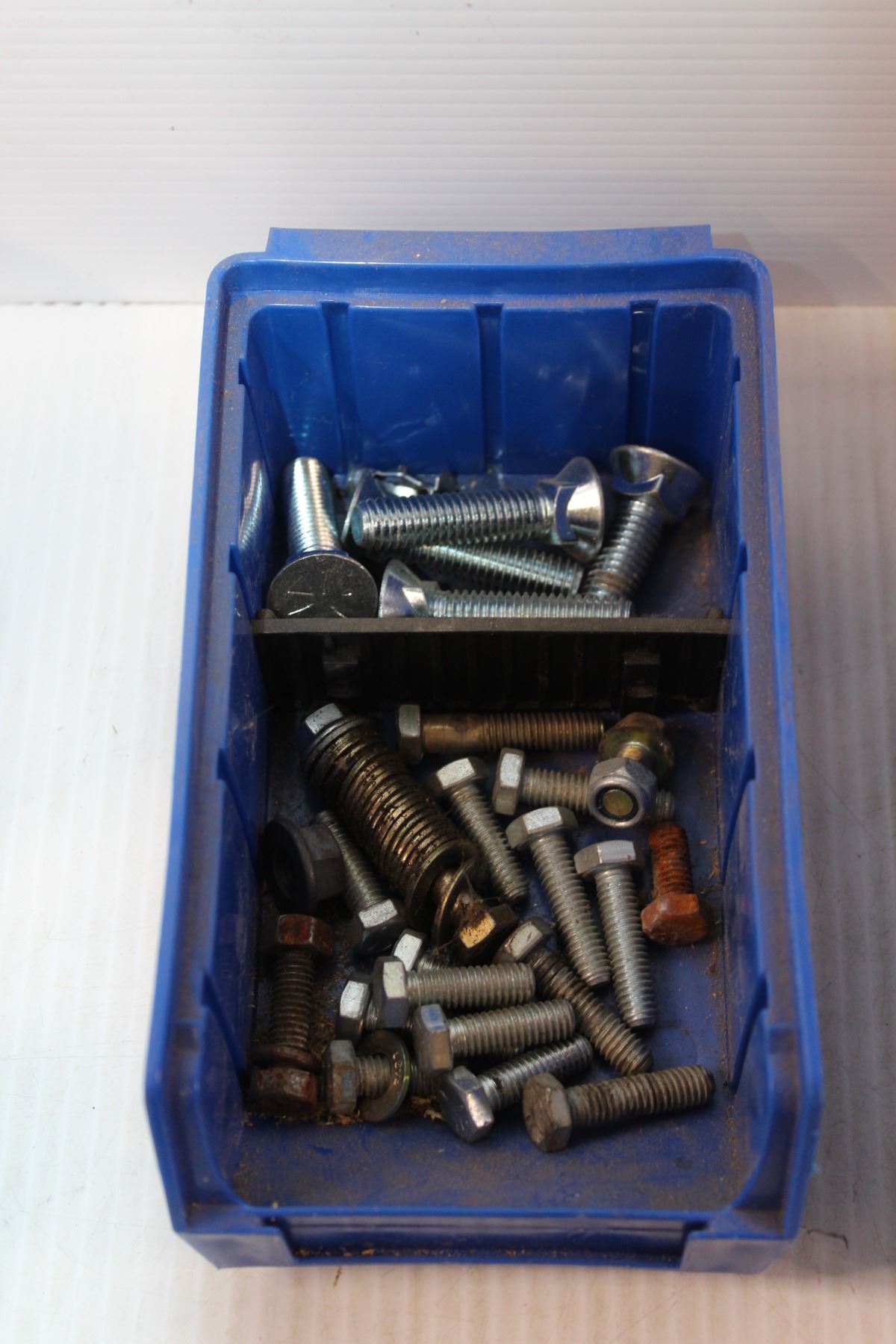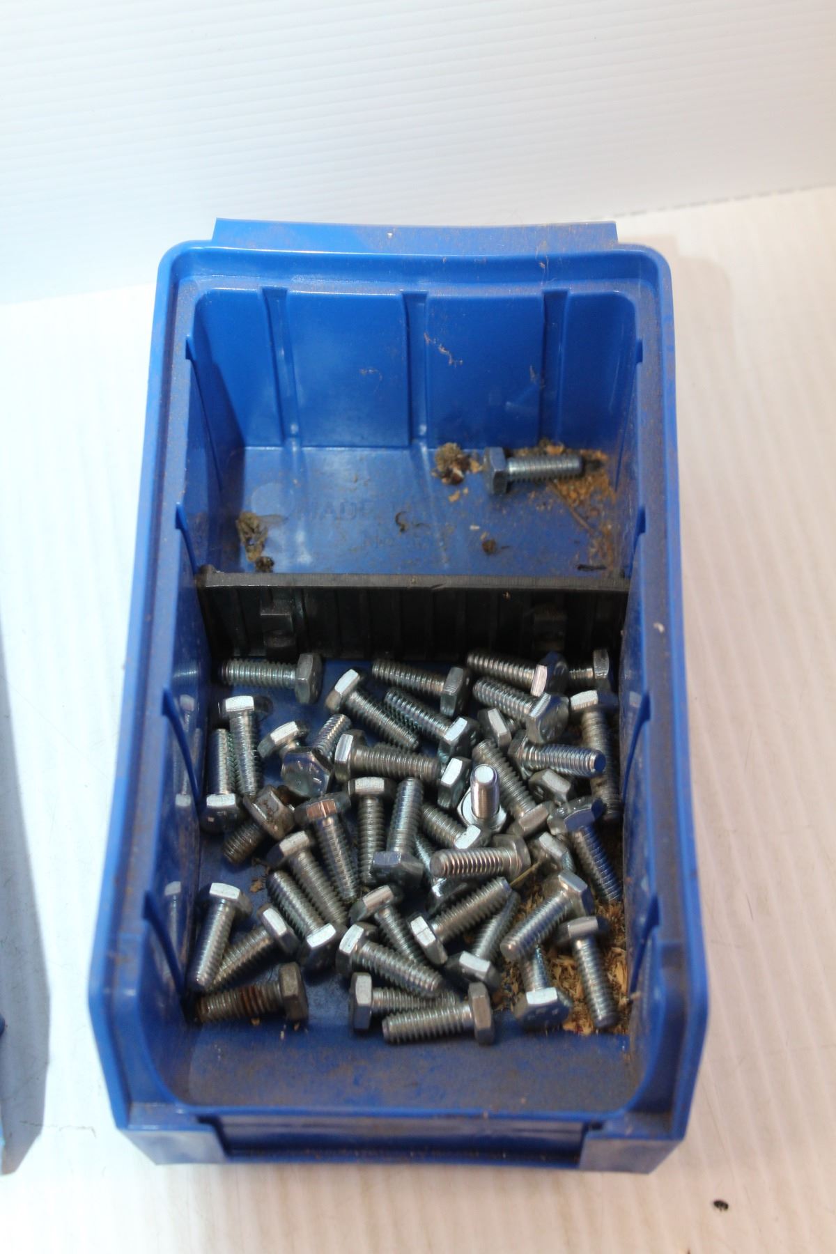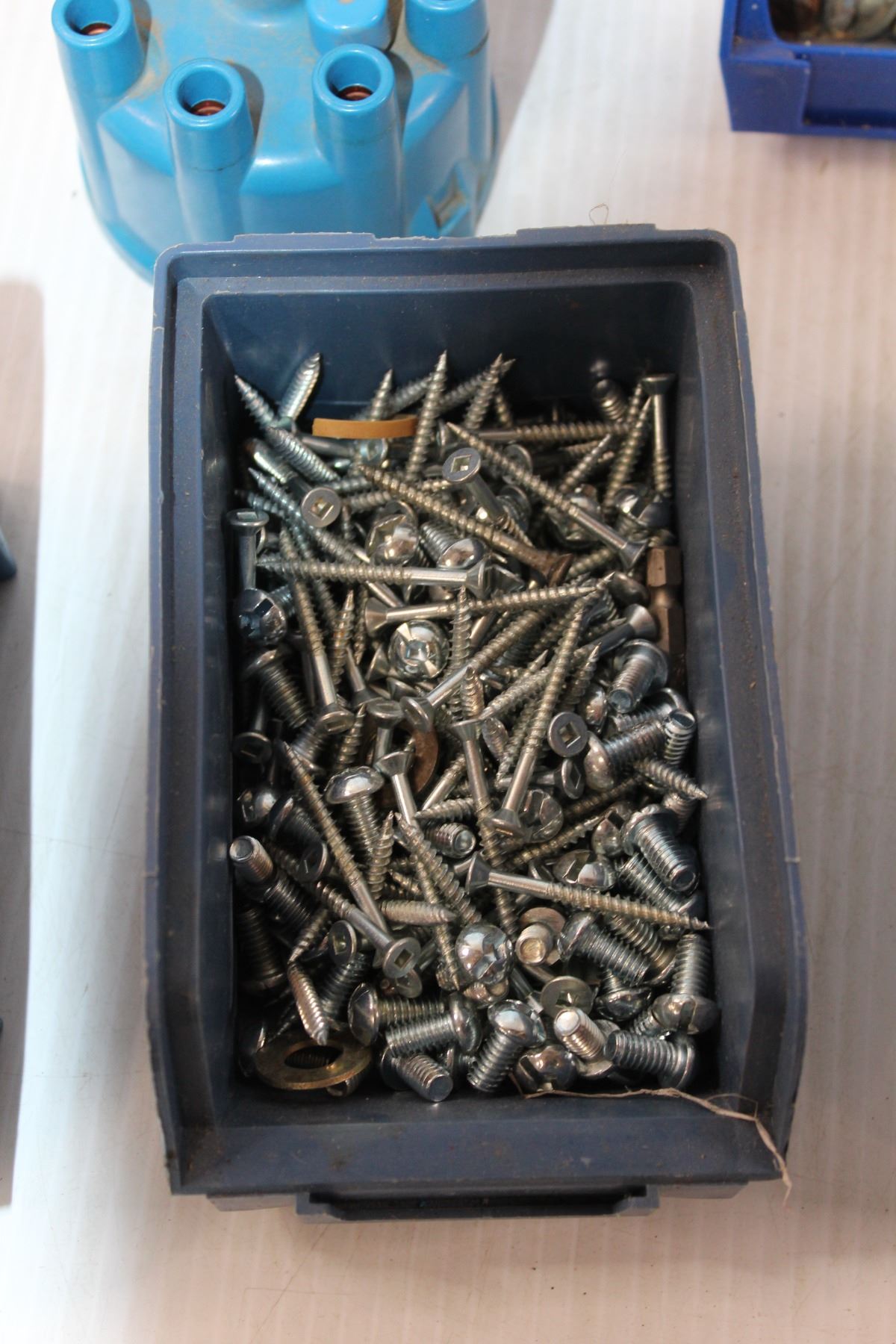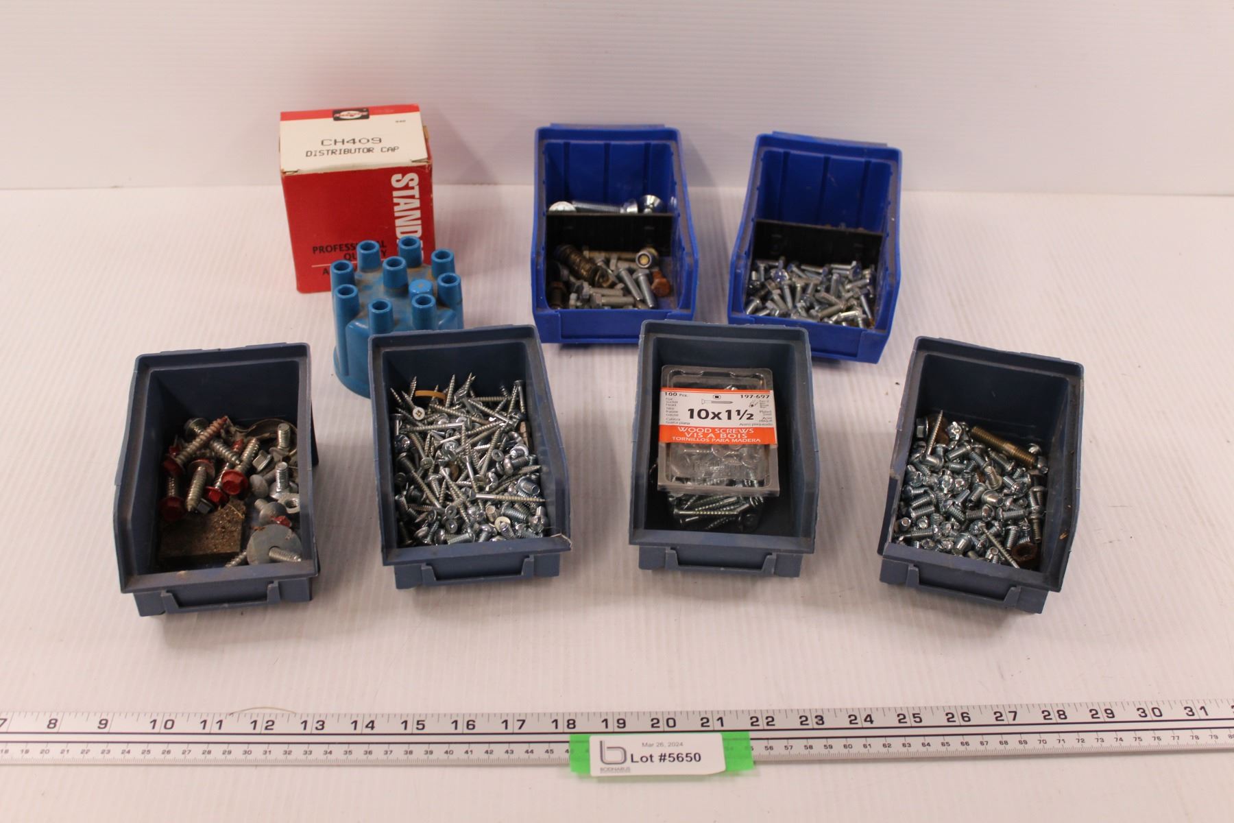 (6) Stackable Hardware Bins w/Bolts, Screws & A Used Distributor Cap