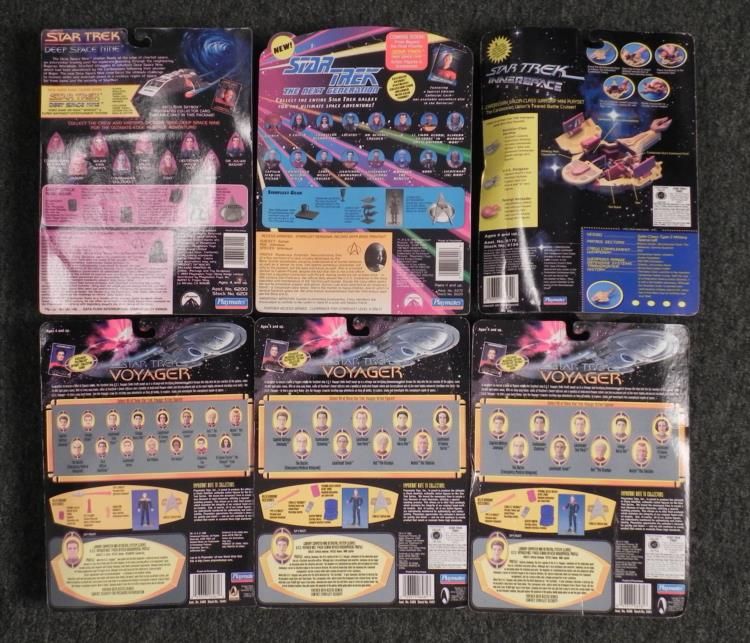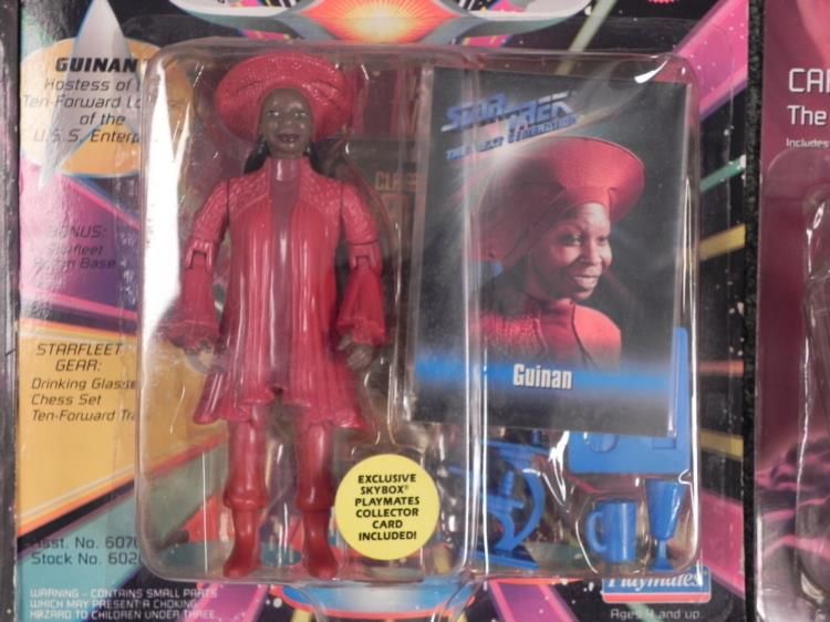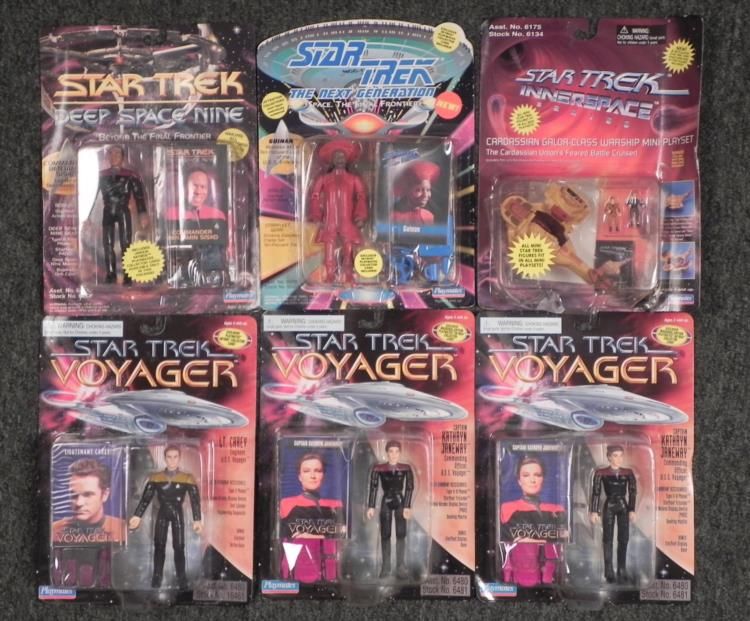 Here are 5 Star Trek action figures and one ship, each Mint on Card, complete with accessories and Skybox collector cards. * * * Deep Space Nine: Commander Benjamin Sisko * Voyager: Captain Kathryn Janeway (x2)Lieutenant Carey * The Next Generation: Guinan * Innerspace: Cardassian Galor-Class Warship Mini Playset