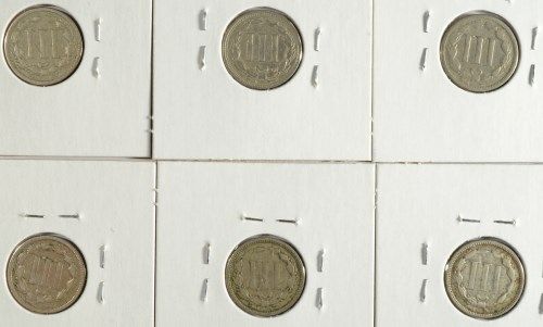 6- THREE CENT NICKELS (65,66,68,69,74,75) VG-FINE