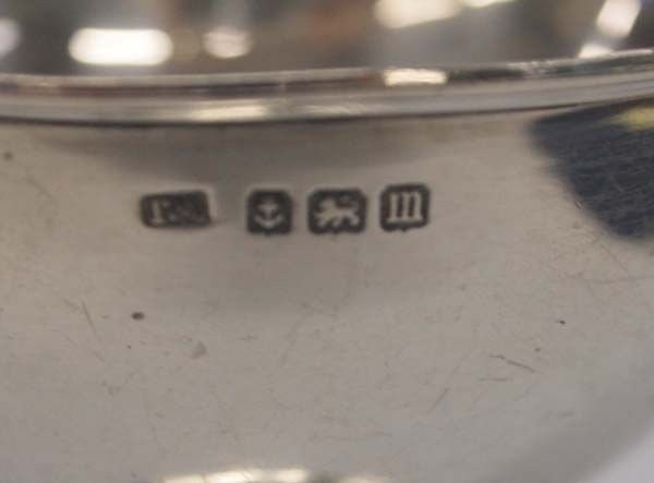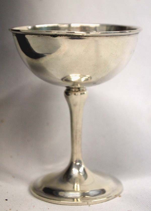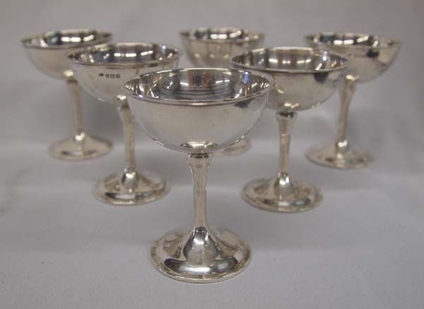 6 Thomas Wooley Sterling Wine/Champagne Goblets 1911-12. Thomas Wooley was a noted Birmingham silversmith, first registering his trade in 1887. These pieces are late in his career, beautifully executed in their regal simplicity with a slight hint of Art Nouveau styling in the stem. The hallmark is "T.W" for Thomas Wooley, the "Anchor" for the city of the assay office, Birmingham, England, the "Lion Passant", indicating sterling silver and the date stamp "M" in a shield punch, which is the date of manufacture 1911-12. They measure 3.5'' H x 2 &5/8'' diameter. Their petite size may indicate an apertif goblet or perhaps, sherry. The wideness of the bowl suggests a toasting champagne set. For whatever use, these are exquisite pieces of a noted English silversmith. Combined weight is 11.8 oz.