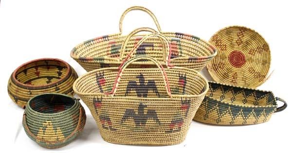 6 Toluca Valley Region Baskets, largest measures 6'' x 16'' x 8''  ''sometimes called a Mariposa stitch, it consists of a wrapped stitch, which separates the coils, and leaves a space between them. It's a main identifying feature of Toluca Valley basketry''