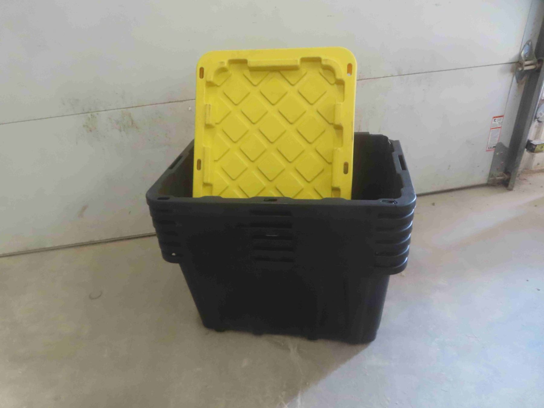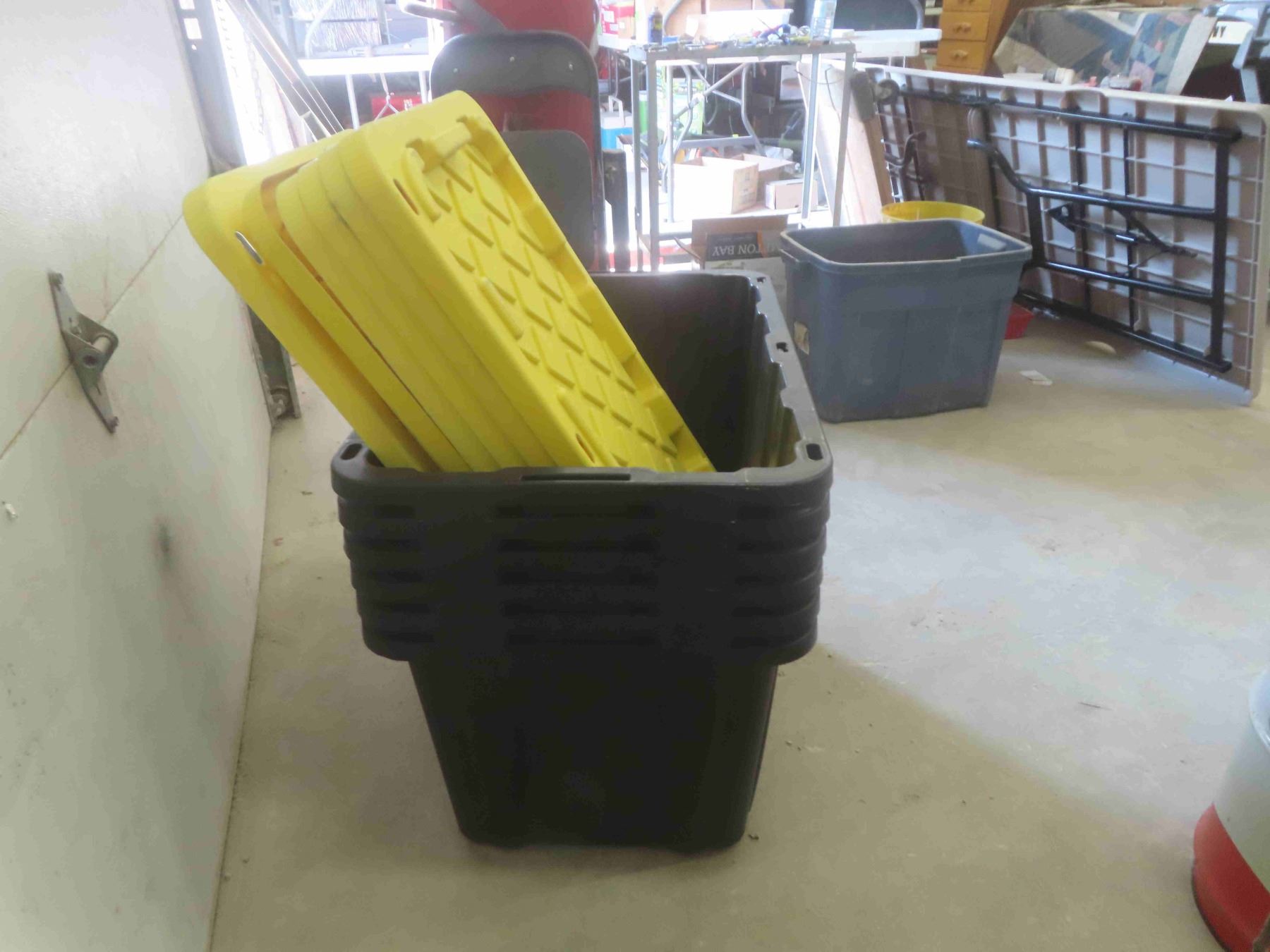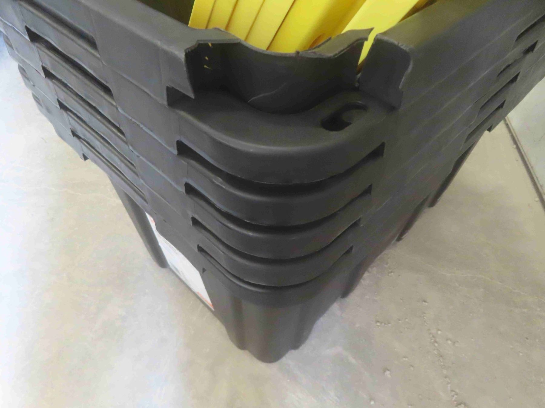 6 Totes w/ Lids102 Litres (1 Tub Damaged Pictured)
