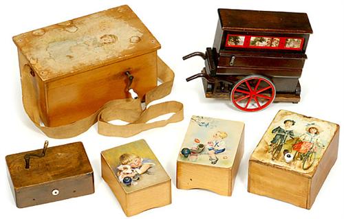 6 Spielzeug-Spieldosen 5 Spieldosen in Holzgehäusen, mit je 1 oder 2 Melodien, zumeist Schweizer Hersteller, jeweils mit Handkurbelantrieb. - Und: Spieluhr von "Reuge" in Form eines Straßenklaviers, Federwerkantrieb. - Alle Musikwerke funktionieren einwandfrei!
