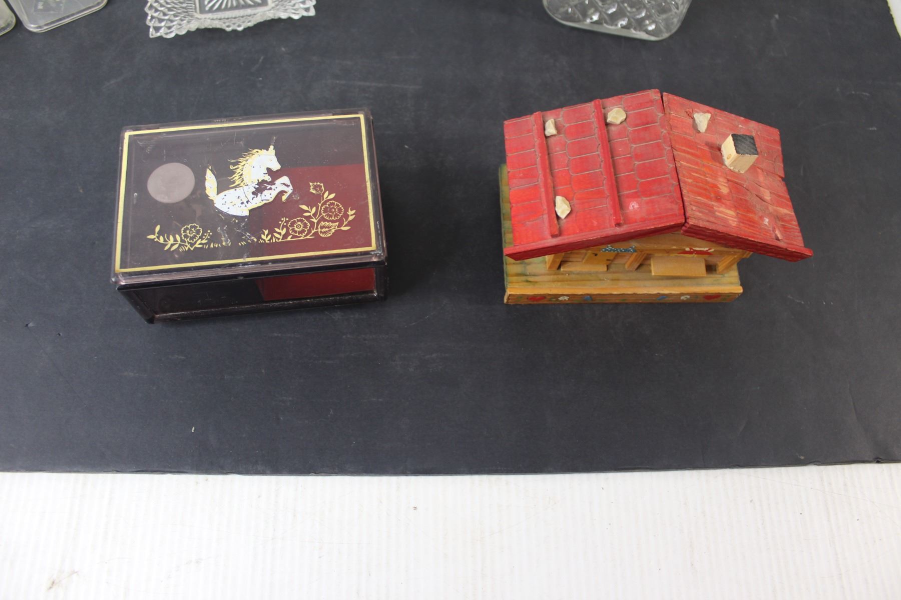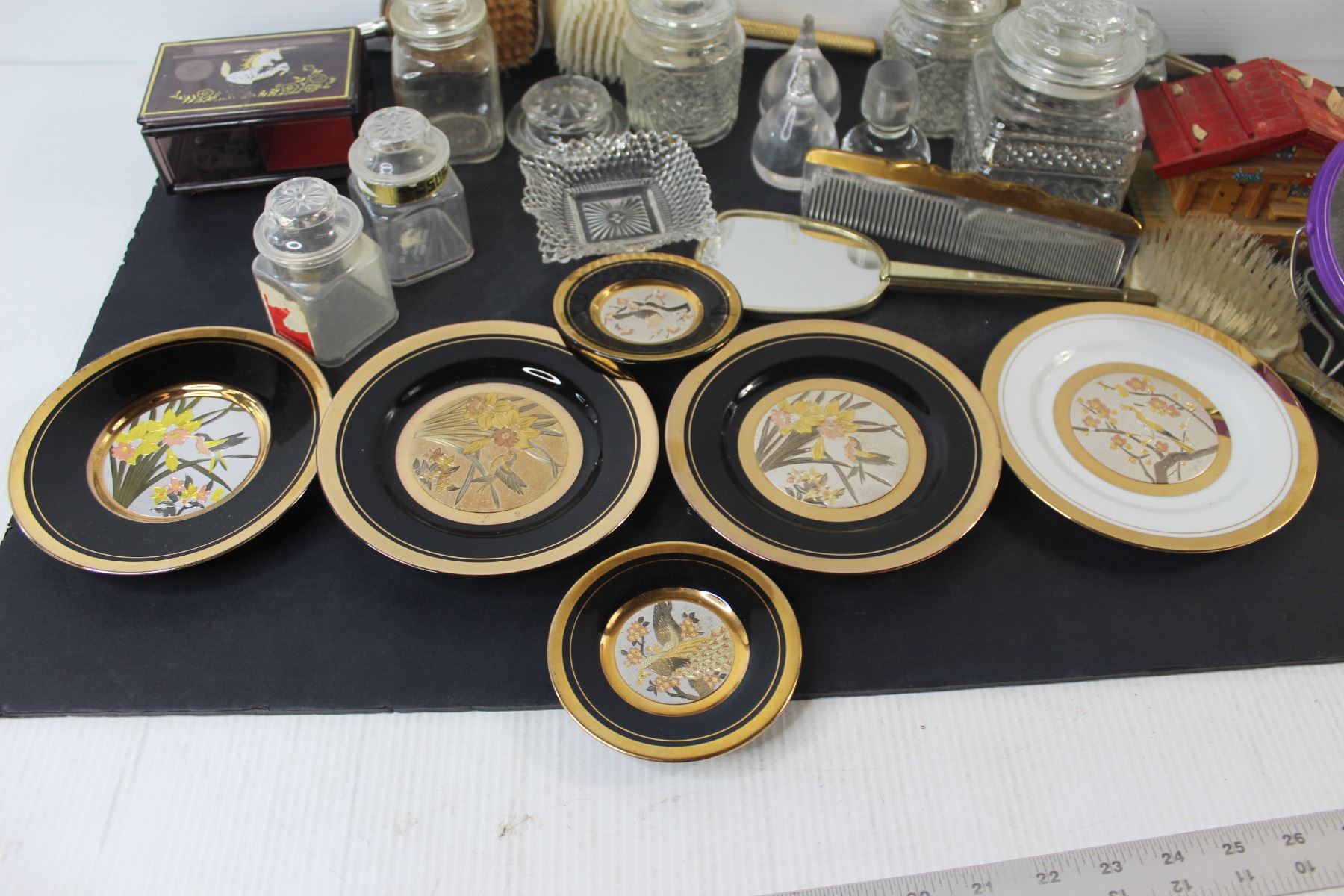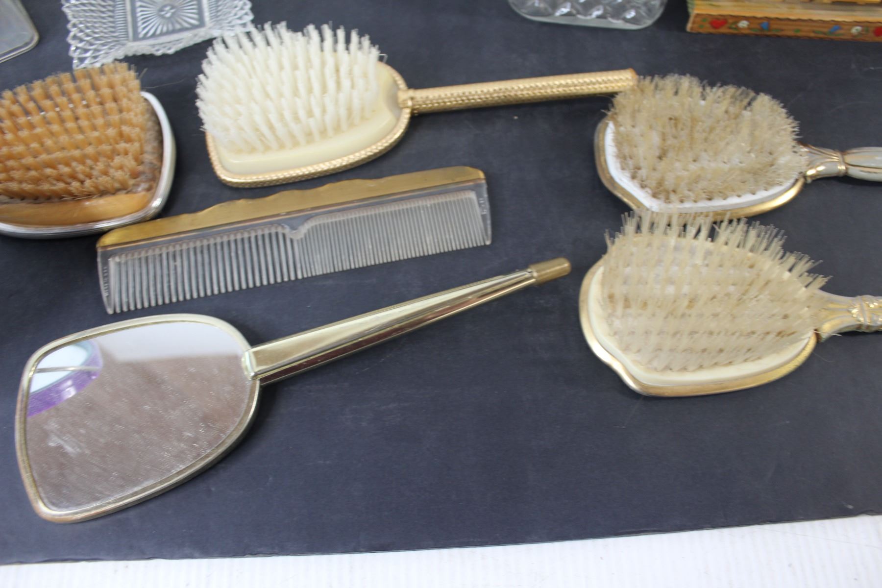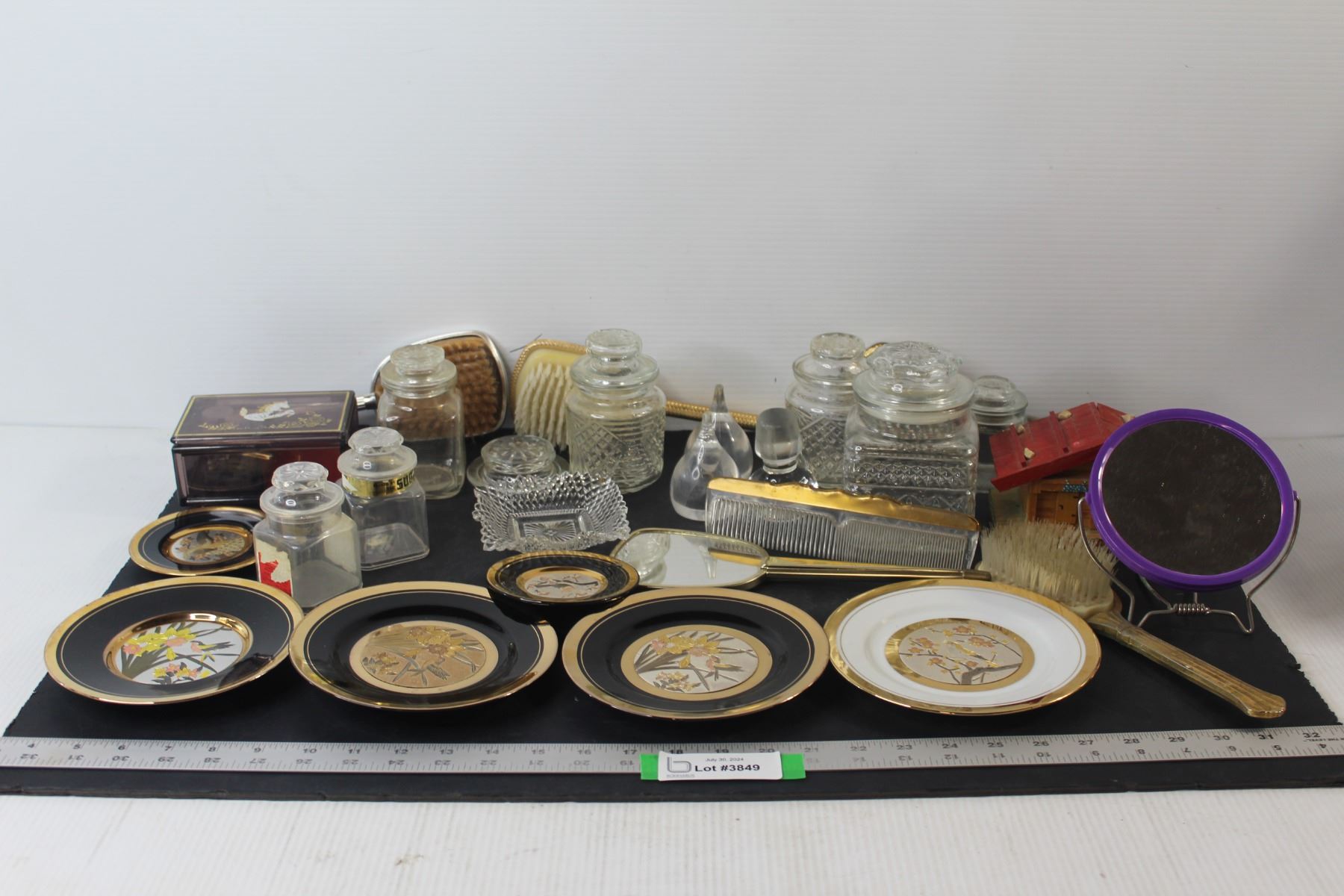 (6) Trays, Glass Tray, (5) Glass Containers, (2) Music Boxes, (4) Brushes
