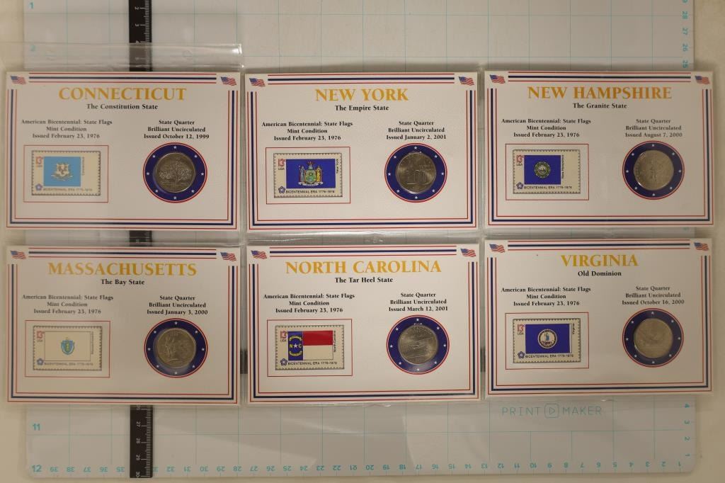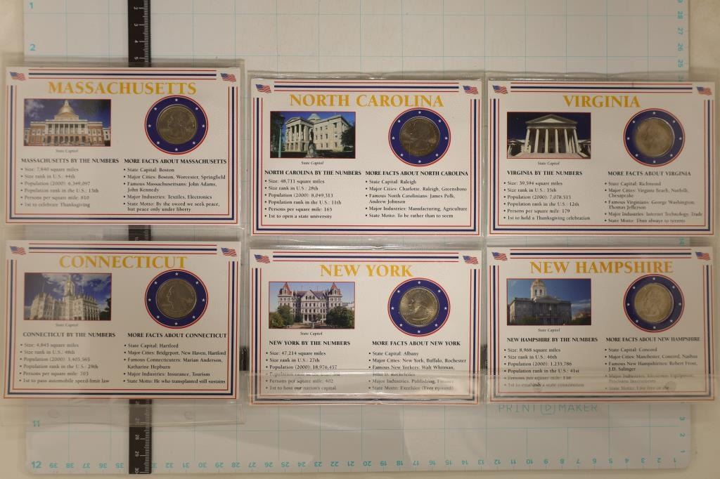 CARDS: 1999-P CONNECTICUT QUARTER, 2000-P MASSACHUSETTS, 2000-P NEW HAMPSHIRE, 2000-P VIRGINIA, 2001-P NEW YORK AND 2001-P SOUTH CAROLINA. ALL IN PLASTIC PAGE HOLDERS