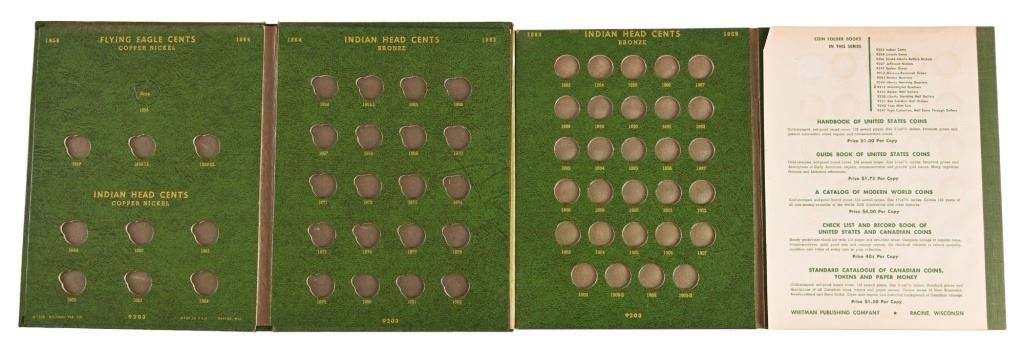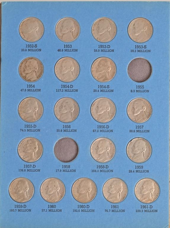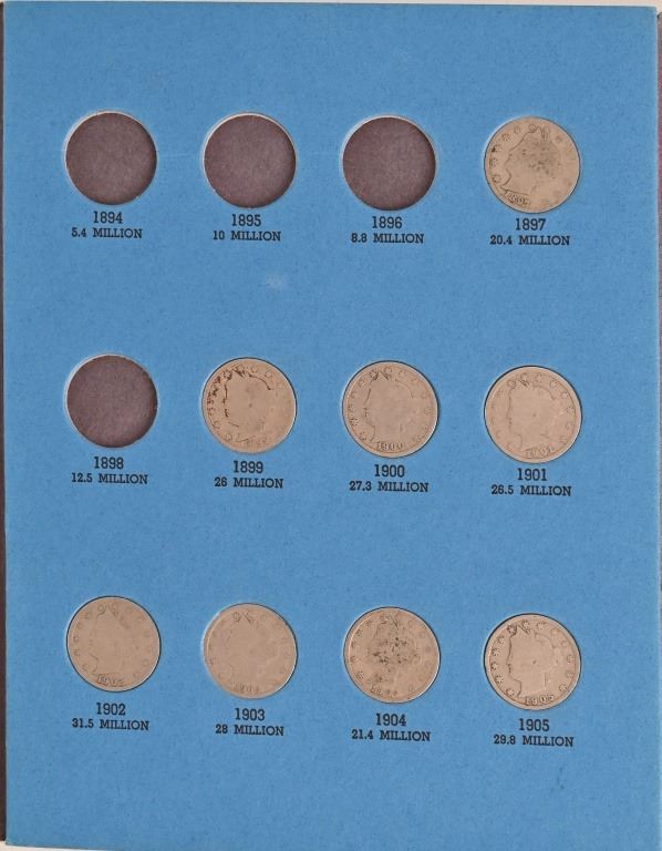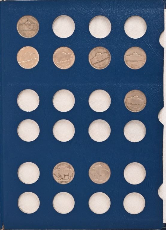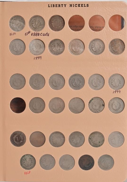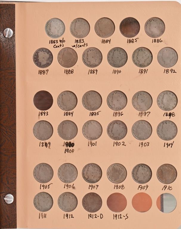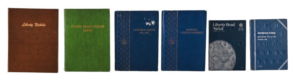 (1) Jefferson Nickel Book 1938 to 1961 containing (46) out of (65). (1) Liberty Head Nickel Book 1883 to 1912 containing (15) out of (33). (1) Liberty Nickels Book 1883 to 1913 containing (31) out of (35). (1) Nickels Miscellaneous Book containing (80) out of (96). (1) Flying Eagle-Indian Cents Book completely empty. (1) Lincoln Cents Book 1909 to 1940 containing (88) out of (90)
