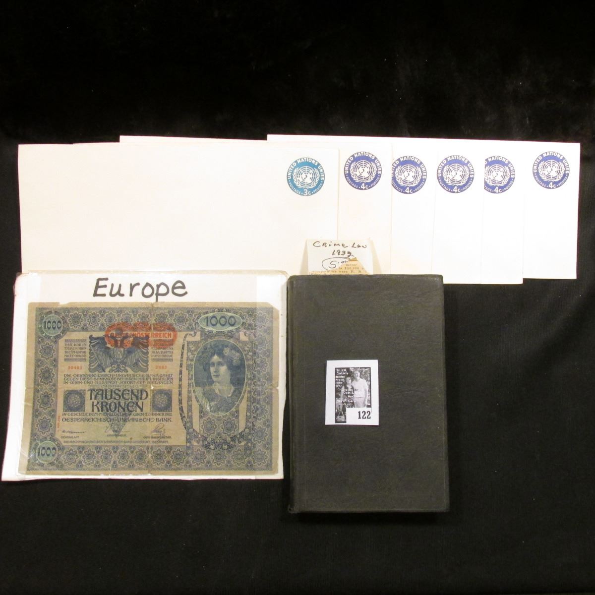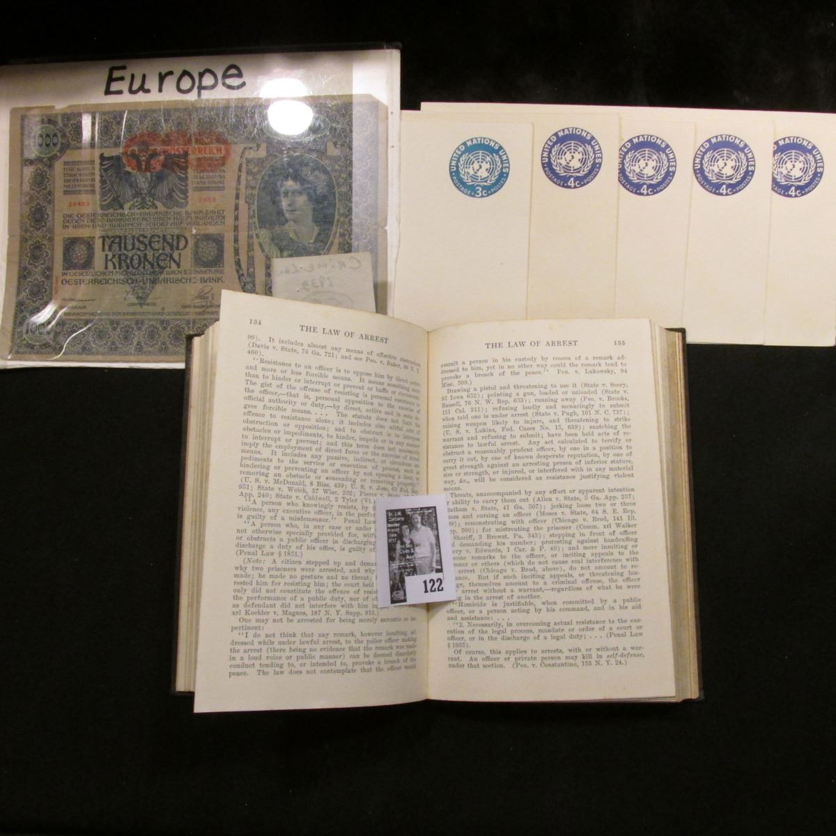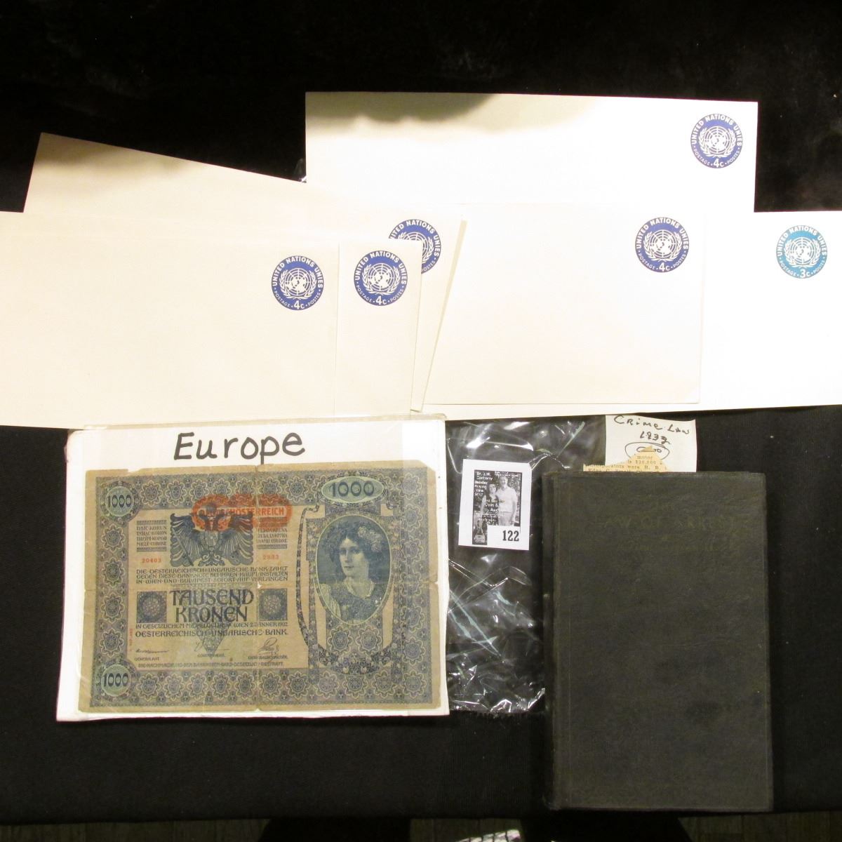 (6) Unused Prestamped United Nations Envelopes; 1932 book "The Law of Arrest", by Clarence Alexander; & 1902 1000 Kronen Austrian Banknote.