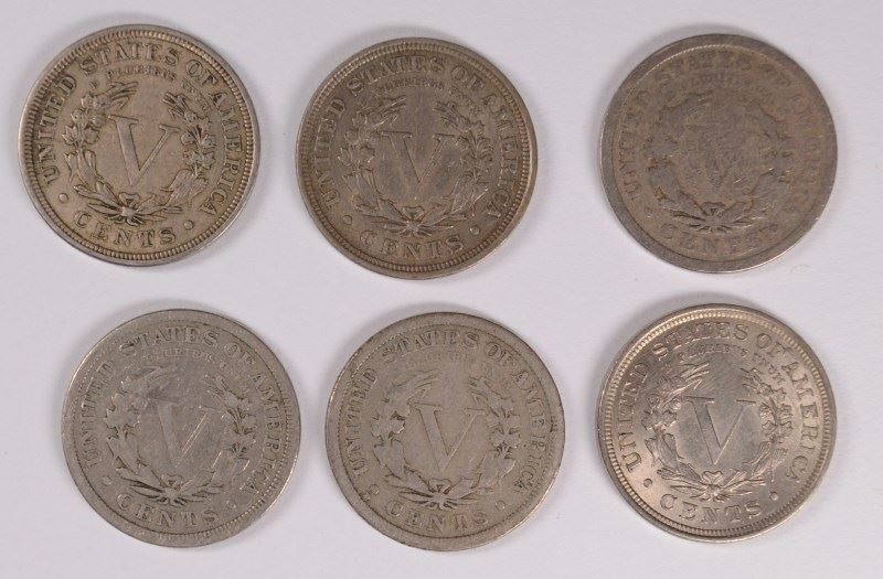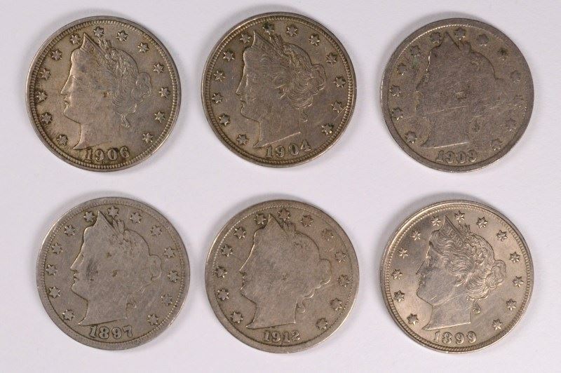(6) V-NICKELS (1897, 1899, 1904, 1906, 1909, 1912-D)