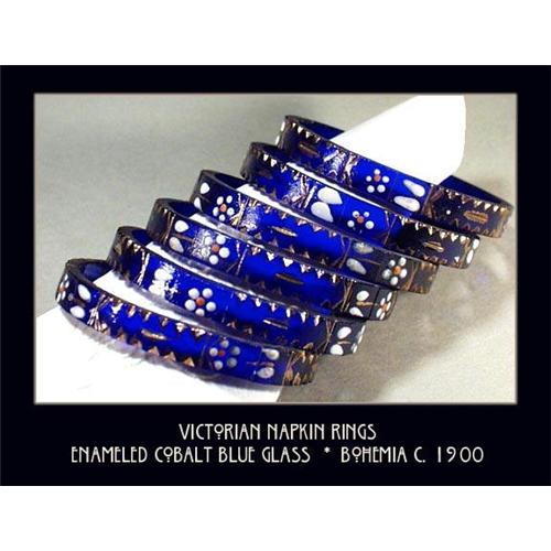 Extremely scarce set of 6 Victorian enameled cobalt blue glass napkin holders. Around 1850 Christianstahl glassworks (Bohemia) began to produced large tubes. These were cut into rings, ornately decorated by glass refiners and sold as napkin rings. Very little of this rarity survived due to its fragility - individual pieces are scarce, a set of six is very rare.... Napkin rings are in excellent condition with no damage chips or repairs. Dimension approx : 2-3/8" in diameter x 5/16" wide.